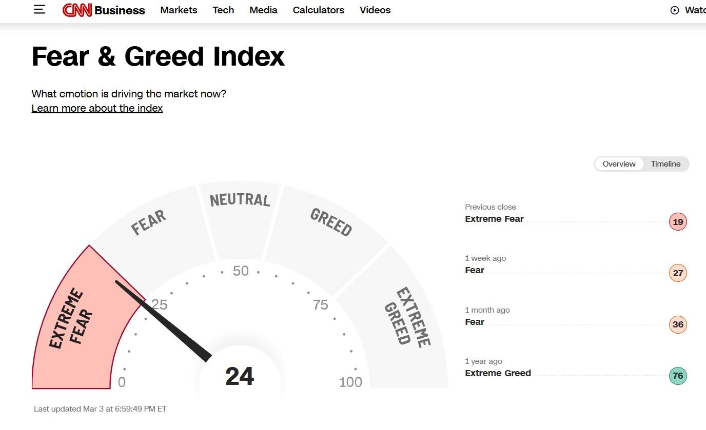 現時,市場避險情緒升溫,恐慌指數(VIX)一夜飆升16%至22.78點,顯示市場認為未來投資風險增加;CNN恐懼與貪婪指數在25以下,表示市場處於「恐慌」的狀態。資金流入債市,美國10年期國債收益率一度觸及4.116%,是去年10月22日以來的最低水平。
