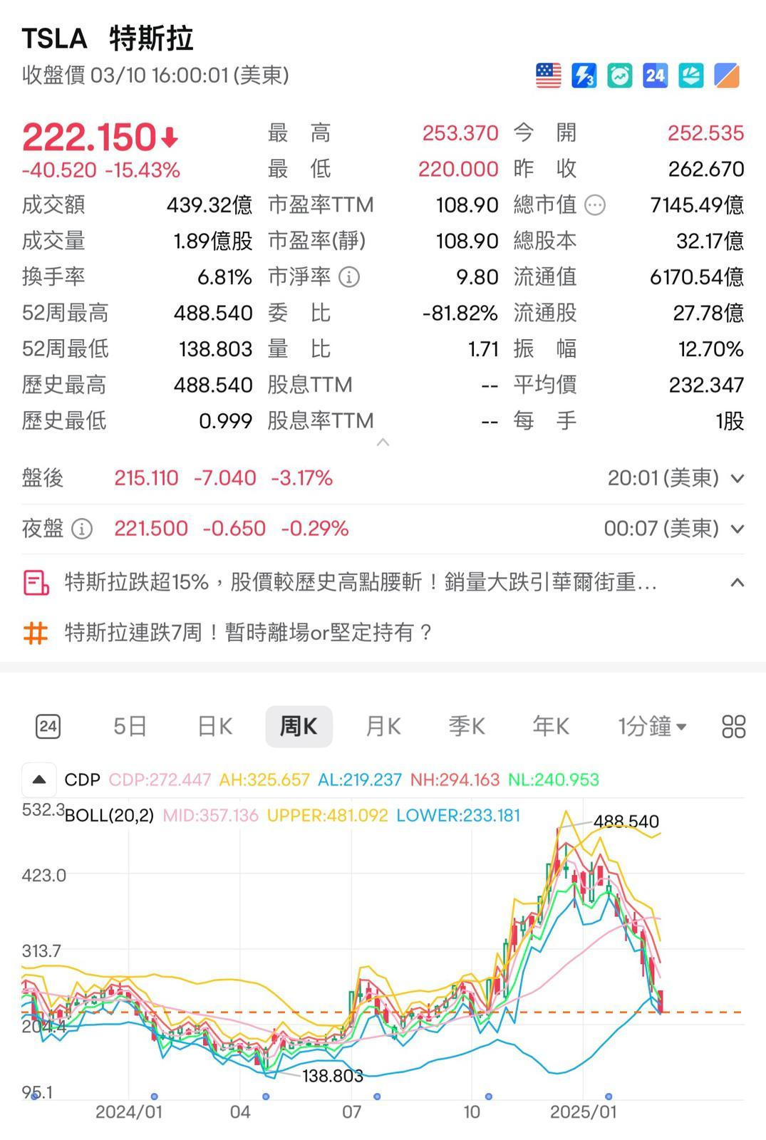 美股隔晚遭遇「黑色星期一」,創下特朗普上任以來的最大單日跌幅,納指下跌4%或727點,為超過兩年來的最大跌幅。電動車巨企特斯拉(Tesla)單日暴跌15%至222.15美元,較去年12月的高位488.54美元累跌逾54%,市值蒸發約8,000億美元。創辦人馬斯克表示,經營企業面臨「非常大的困難」,但預期將在特朗普政府再任職一年。