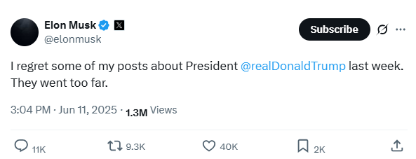 特朗拉(Tesla)行政總裁馬斯克上周在社交平台與美國總統特朗普隔空對罵,甚至指特朗普在已故淫媒富豪愛潑斯坦(Jeffrey Epstein)的「尋歡」名單上,引發全球關注。事隔數日,馬斯克終於在社交平台X向特朗普疑似道歉,他表示對上周發表了一些關特朗普的帖子感到後悔,並指當中的內容「說得太過份(They went too far)」。特朗拉股價在美股夜盤升近2%,報322.5美元。