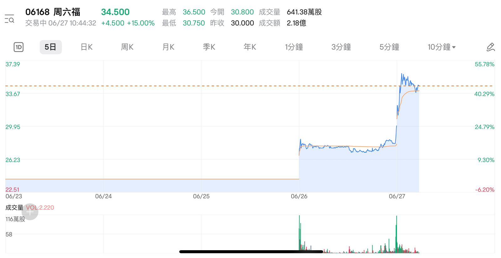 內地珠寶商周六福(6168)上市第二日,今早(27日)股價繼續炒上,一度高見36.5元,急升21.7%,以此價計算,周六福股價比招股價24元,高出52%,若以每手100股來計算,一手最多可賺1,250元。
