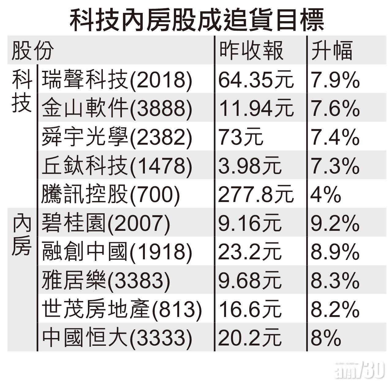 近月捱沽的板塊再成追貨目標,「股王」騰訊控股(700)全日最多大升6.1%,見283.2元,收市仍漲4%,報277.8元,連升兩日累漲逾一成。其他手機及科網股集體大反彈,金山軟件(3888)、丘鈦科技(1478)、瑞聲科技(2018)及舜宇光學(2382齊齊飆逾7%。內房股亦領漲大市,碧桂園(2007)急升9.2%為表現最好藍籌;中海外(688)及華潤置地(1109)同增4.7%。騰訊及碧桂園昨亦為成北水掃貨焦點,前者滬深兩市淨買額3.5億元,後者淨買額1.3億元。