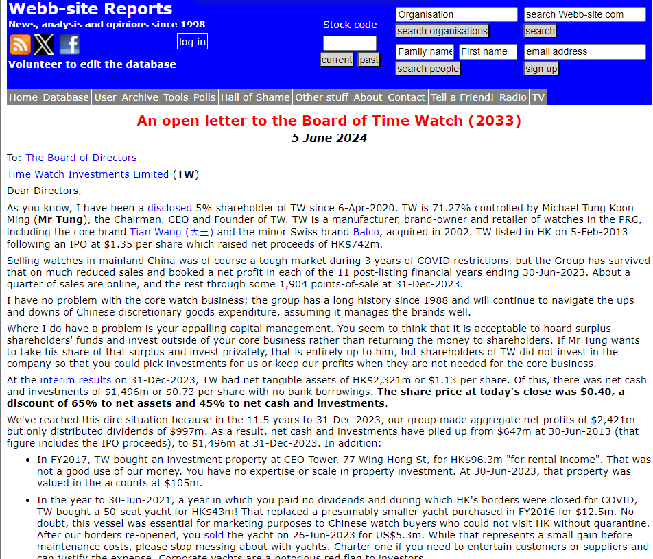David Webb在公開信中表示,時計寶以不合理的理由,囤積大量閒置資金。他指出,根據時計寶截至2023年底的中期業績,時計寶的有形資產淨值為23.21億港元,即每股1.13元,其中,淨現金和投資為14.96億元,即每股0.73元,沒有銀行借款;而截至6月5日收市價為0.40元,較淨資產折價65%,較淨現金和投資折價45%