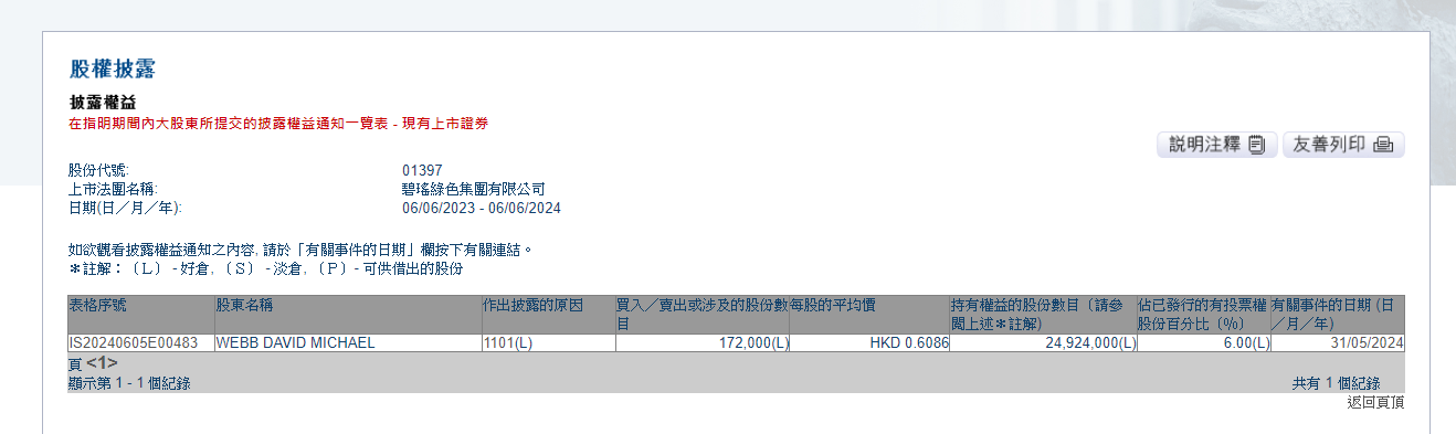 據聯交所的股權披露顯示,David Webb於5月31日增持碧瑤綠色,涉及股份數目達17.2萬股,均價0.6086元,總涉資10.46萬元,其持股量由5.96%升至6%。