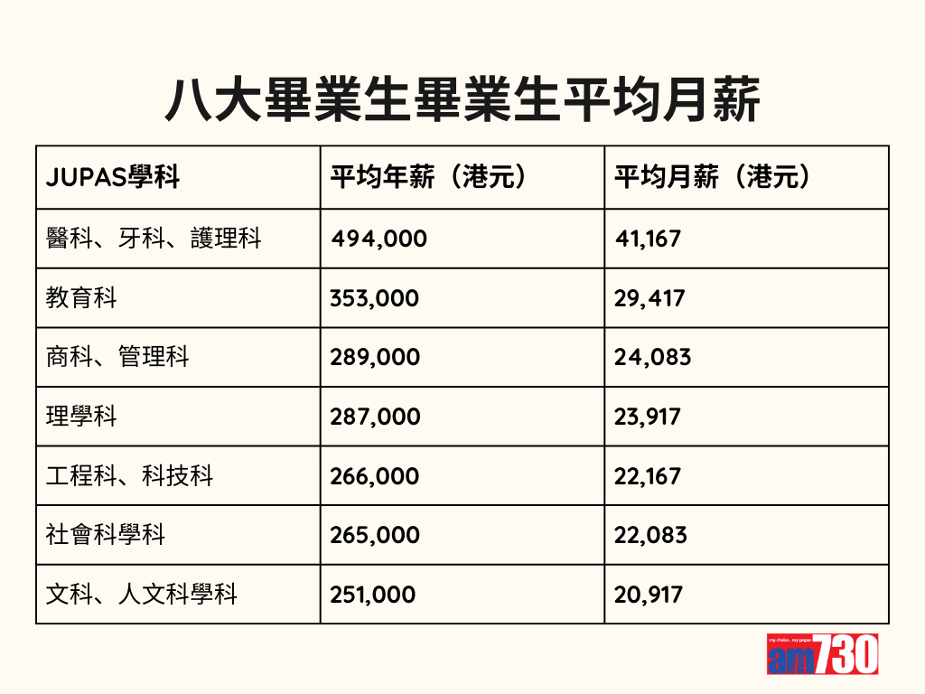 DSE放榜|八大畢業生薪酬排名 呢間大學年薪最高平均一年達38.5萬(am730製圖)