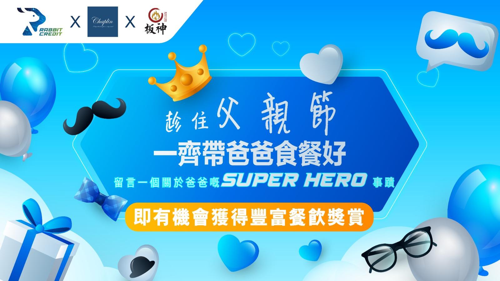 於月兔信貸(Rabbit Credit)留言寫下關於爸爸嘅「超級英雄」事蹟,以及完成簡單步驟,即有機會獲得價值高達HK$1,376餐飲獎賞!