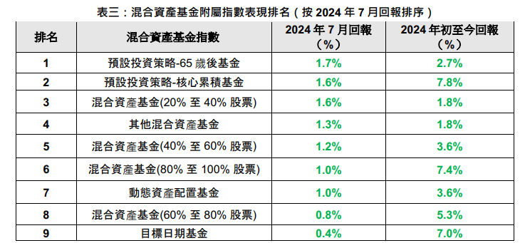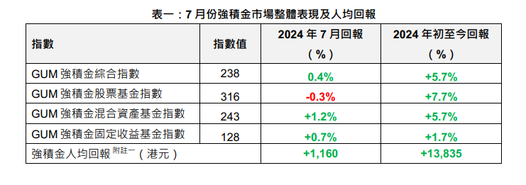 強積金顧問公司GUM公布7月份強積金數據,回報上升0.4%,人均賺1,160元。期內股票基金指數跌0.3%;混合資產基金指數升1.2%;固定收益基金指數升0.7%。