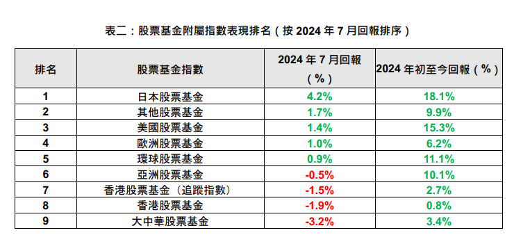 據GUM各項數據顯示,7月回報最好為日本股票基金,漲幅達4.2%,年初至今回報18.1%;至於大中華股票基金7月回報最差,跌幅達3.2%,年初至今回報錄上升3.4%。