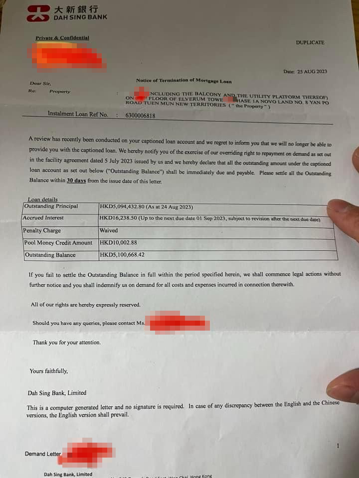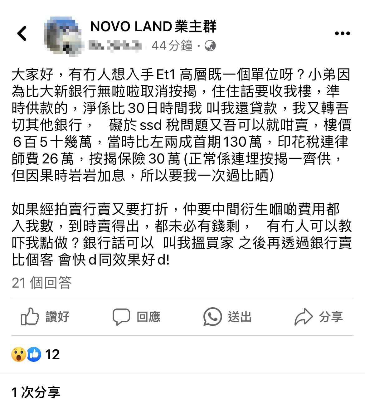 近日有NOVO LAND業主於Facebook群組中,放售自己高層單位,並聲稱因突遭大新銀行「Call Loan」還款,要求於30日內償還樓按貸款及利息。