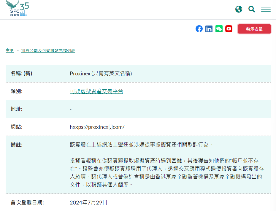 證監會已於2024年7月29日起,將Proxinex及其相關網站列入證監會的可疑虛擬資產交易平台警示名單。雖然相關網站目前已經無法瀏覽,但公眾應提防騙徒可能持續建立域名相似的網站。