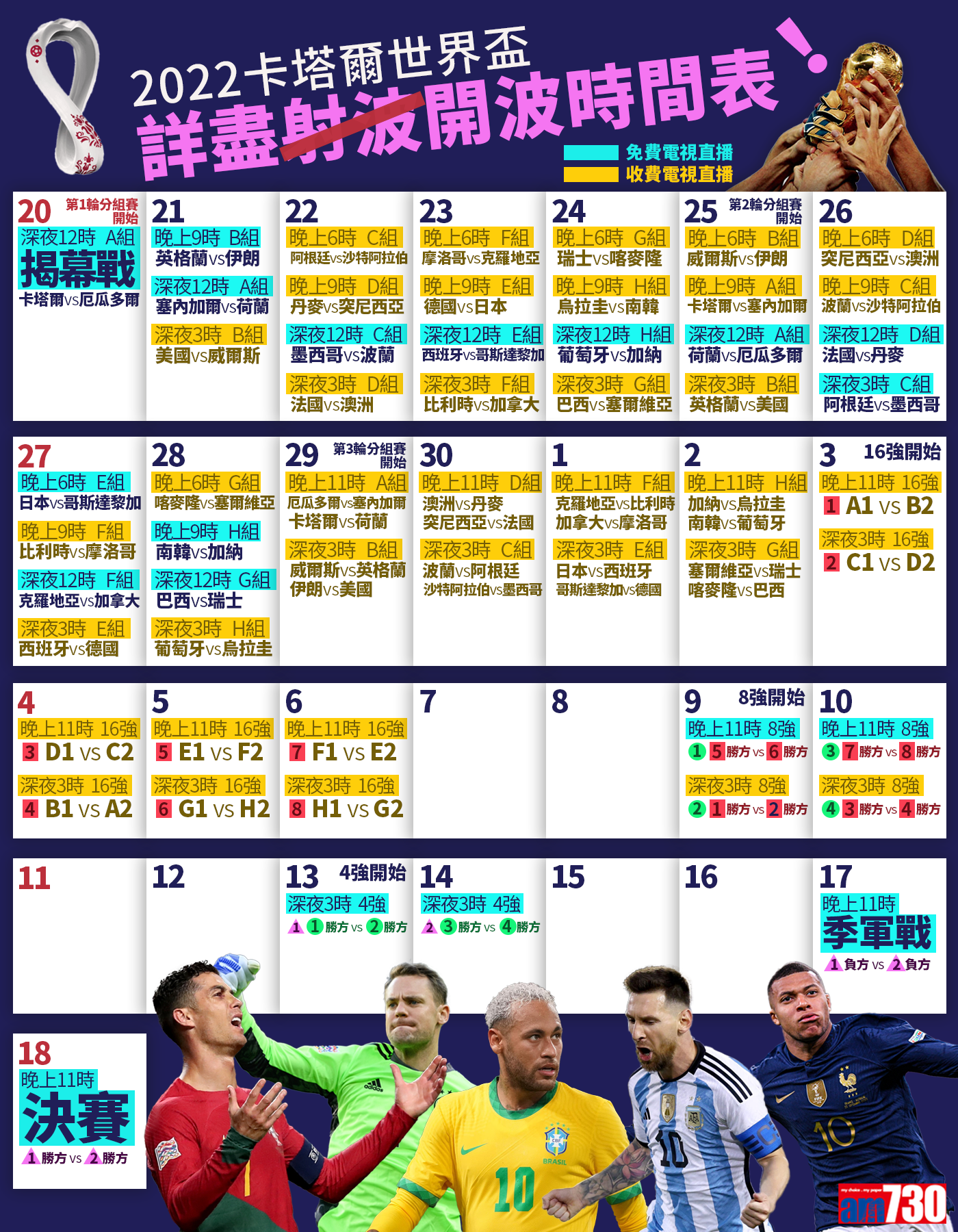 世界盃2022將於11月20日起至12月18日在卡塔爾展開。第21個比賽日將會上演決賽賽事,香港時間12月18日晚上11時,阿根廷將與法國爭冠,ViuTV 99台將會免費直播,球迷亦可於NowTV或NowE收看,或到各大商場免費收看。《am730》網站及手機應用程式亦將會作文字直播。