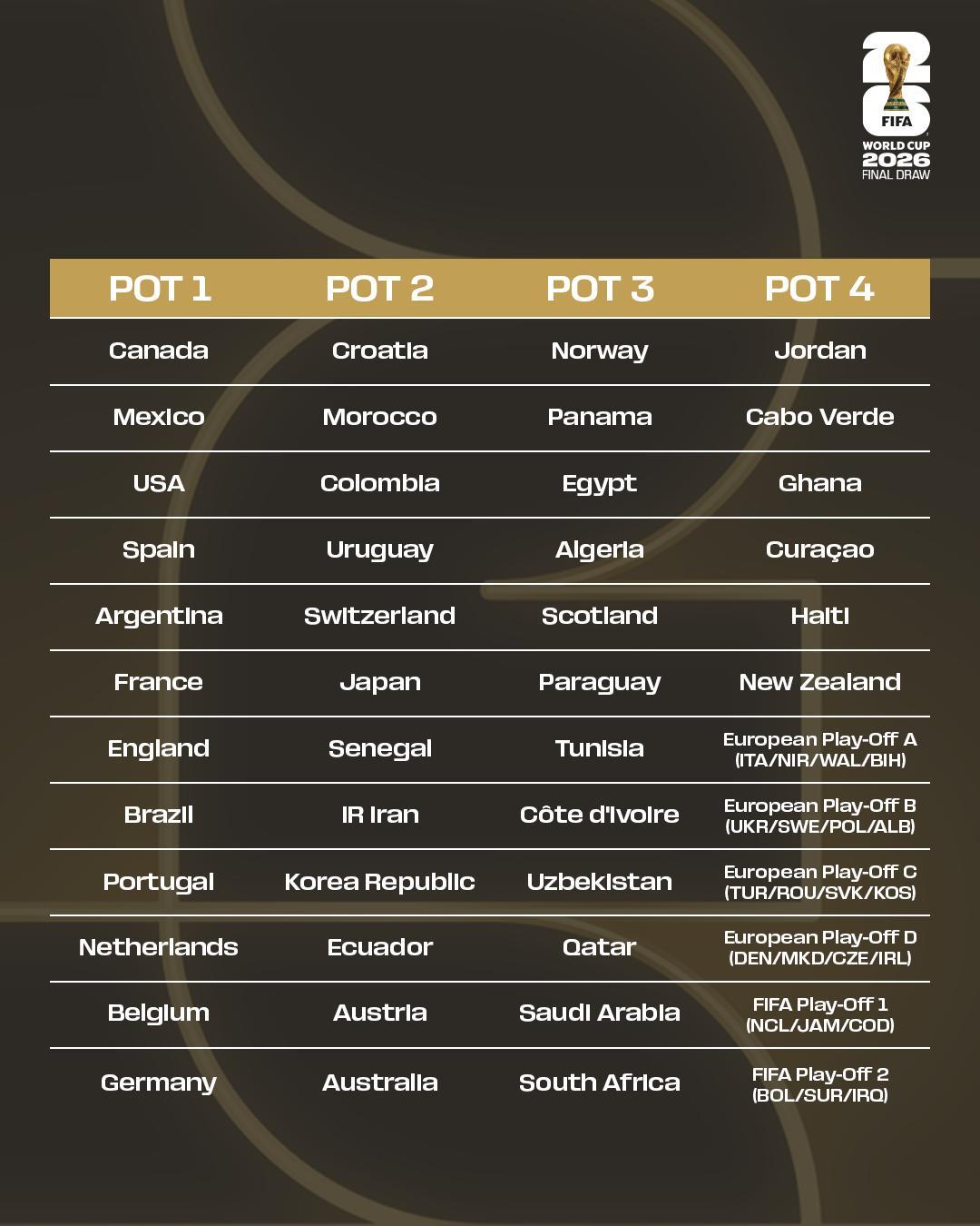 世界盃2026︱種子排名(FIFA) 世界盃2026︱種子排名(FIFA) 世界盃2026︱32強淘汰賽出線形勢(FIFA)