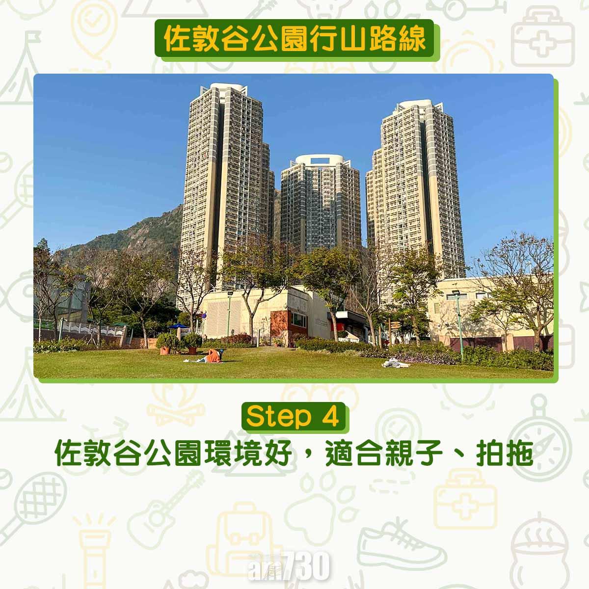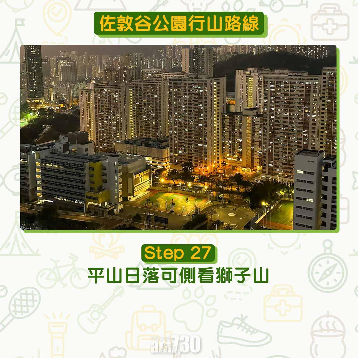 佐敦谷公園交通方便,設兩塊大草原親子野餐曬太陽看紅葉,親子樂、拍拖打卡一流。接上佐敦谷公園晨運徑行山約15分鐘抵平山山頂,靜候九龍東夕陽靚日落。由佐敦谷登平山路程短和全程柏油路,是新手行山賞日落路線。