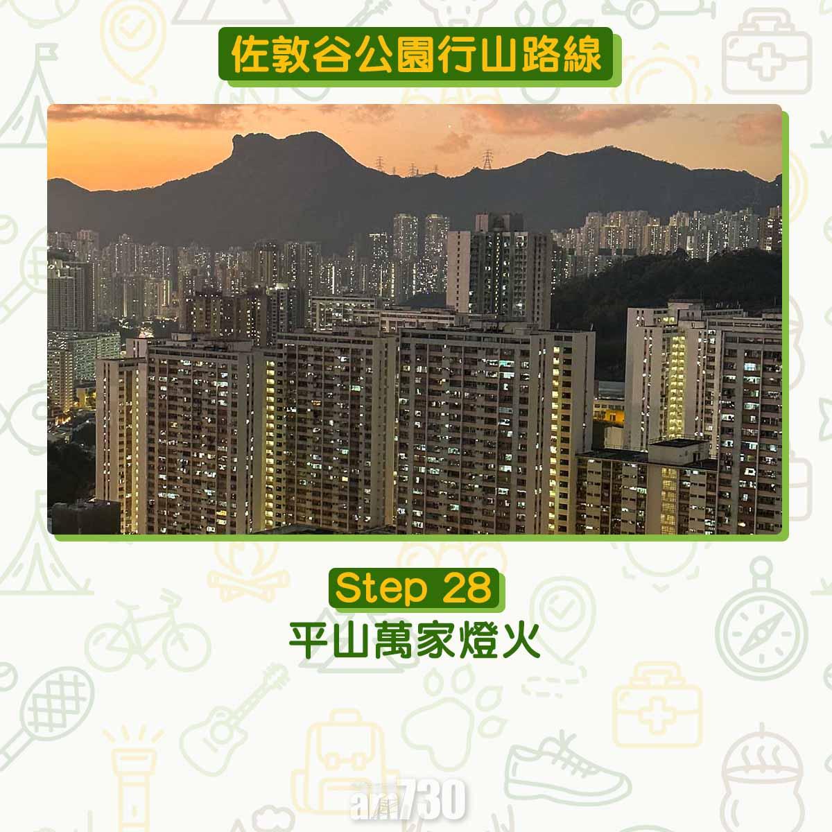 在佐敦谷意猶未盡,可到後方的平山輕鬆行山看日落。由佐敦谷前往平山的方法很簡單,在地圖上的11號涼亭和緩跑徑旁離開,沿大路右轉上樓梯佐敦谷公園晨運徑,若行維修樓梯一樣會接上大路。接近山頂前,右方有一面平地可回望沈雲山、佐敦谷公園和飛鵝山。10分鐘內抵平山三角測量站,平山高188.9米,前身平山石礦場於1974年關閉。
