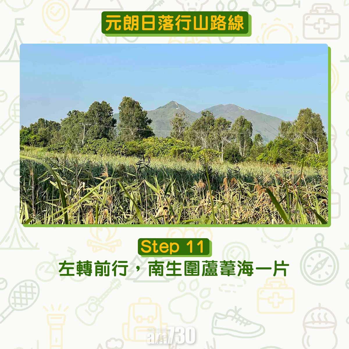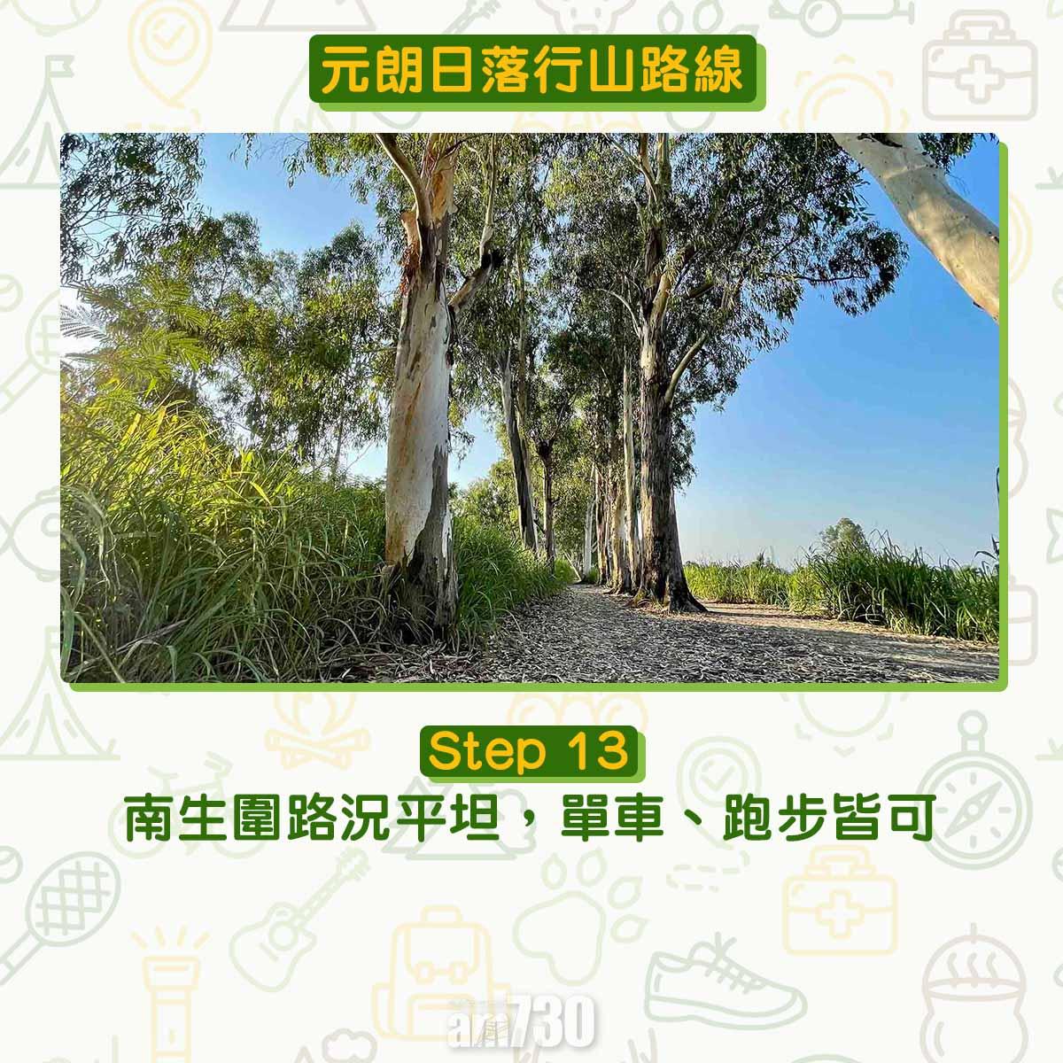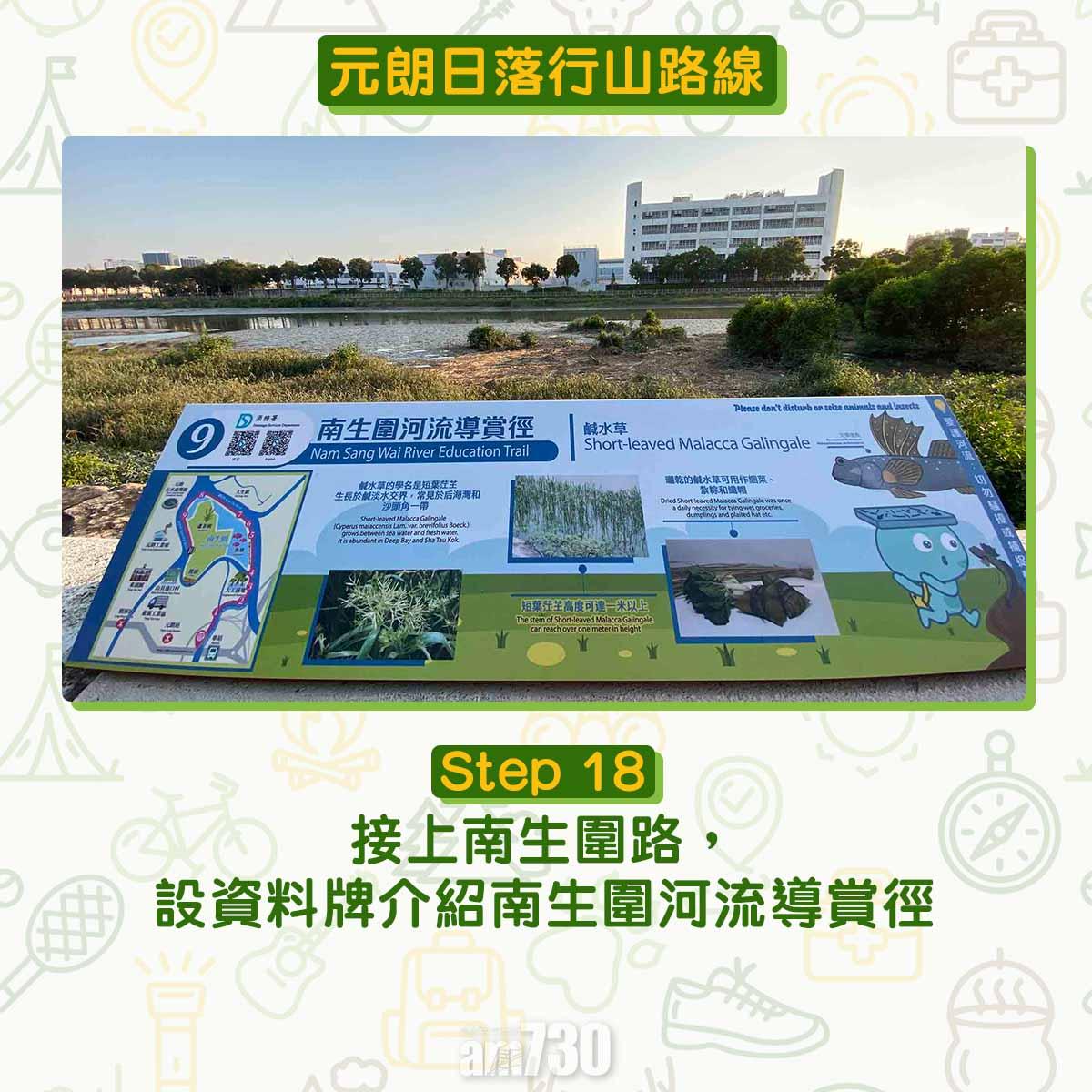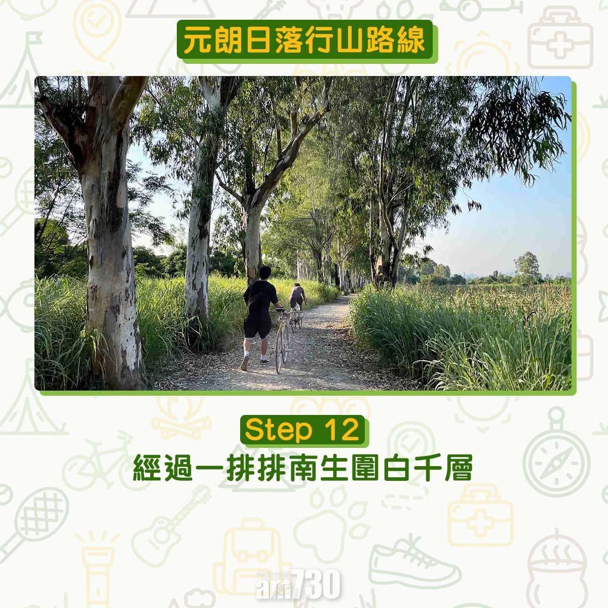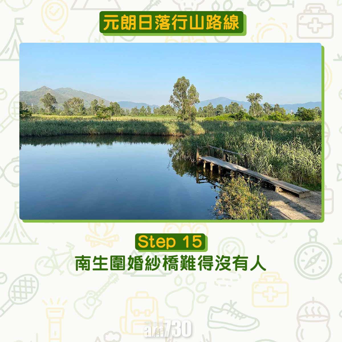 南生圍河流導賞徑距離為5.5公里,如果由元朗站經南生圍(Nam Sang Wai)繞一圈大約9公里,踩單車或自駕遊甚至跑步皆宜。打卡聖地婚紗橋、白千層樹林、大草原,加上日落都是南生圍受歡迎的原因。文︰山全部都係山