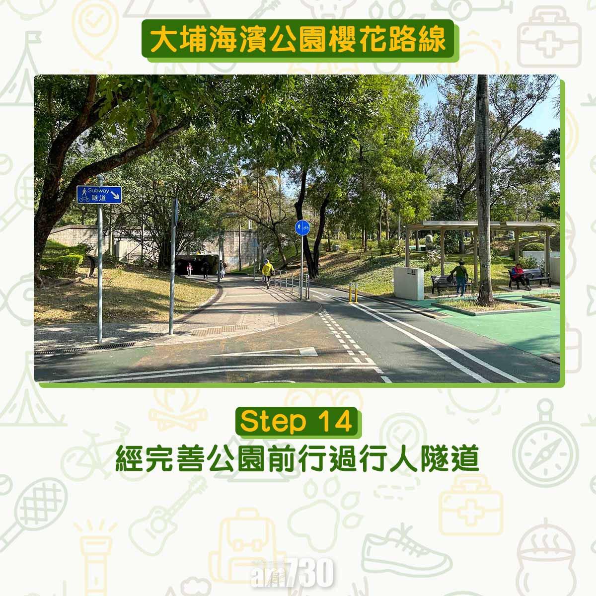 風箏放飛區與橋底公廁間︰即大埔海濱公園地圖的(5)與(7)間,當眼處種植了數棵富士櫻,高度非常適合打卡拍照。