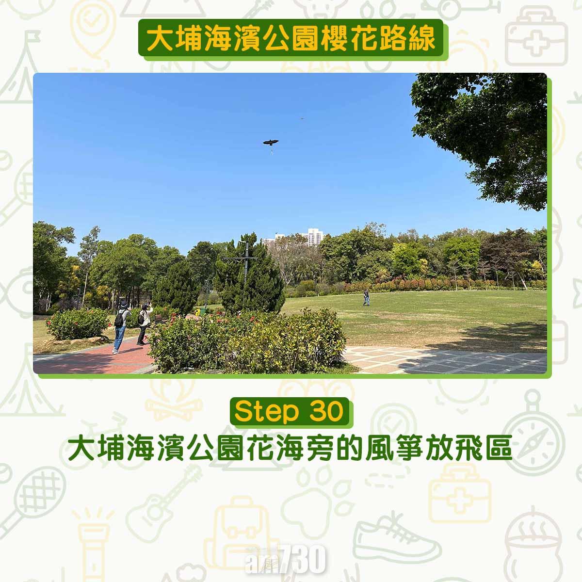 風箏放飛區與橋底公廁間︰即大埔海濱公園地圖的(5)與(7)間,當眼處種植了數棵富士櫻,高度非常適合打卡拍照。