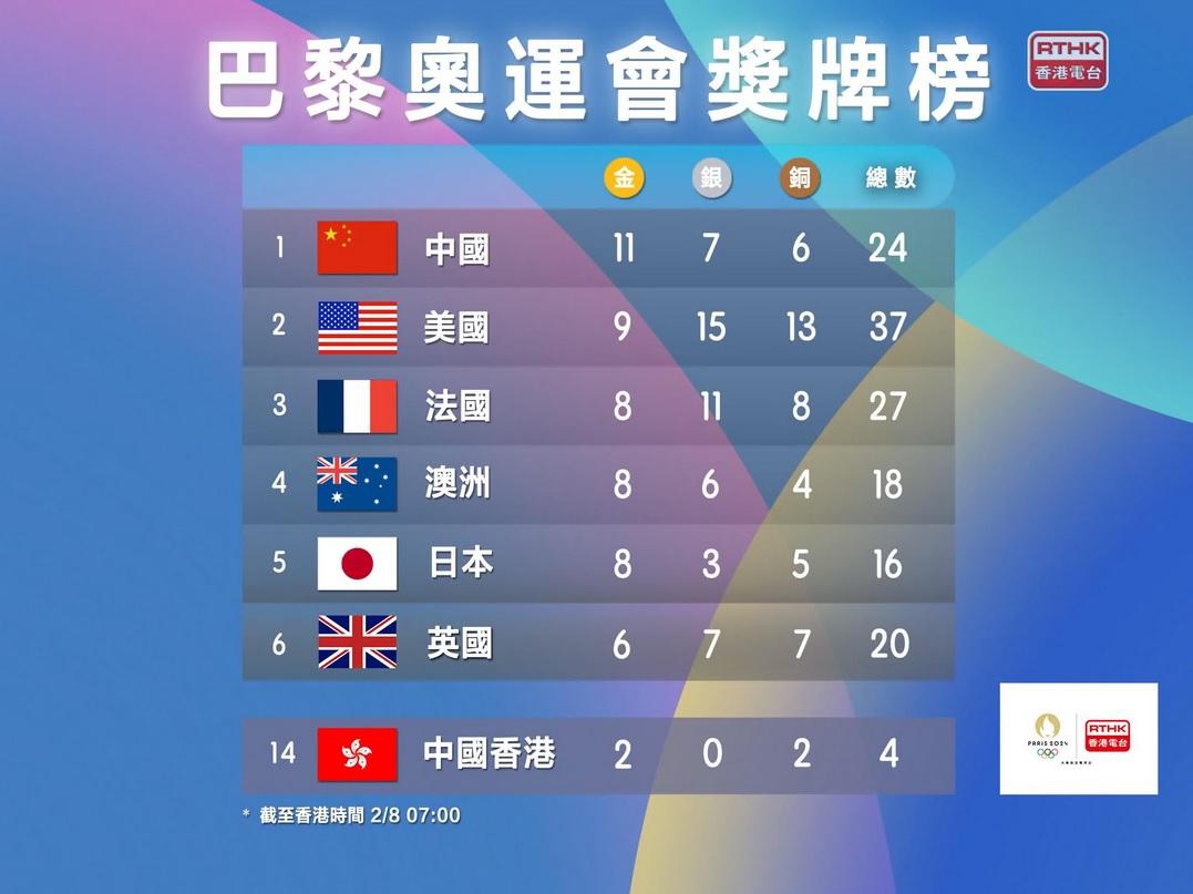 巴黎奧運獎牌榜|中國隊增2金3銅繼續居獎牌榜首。(港台圖片)