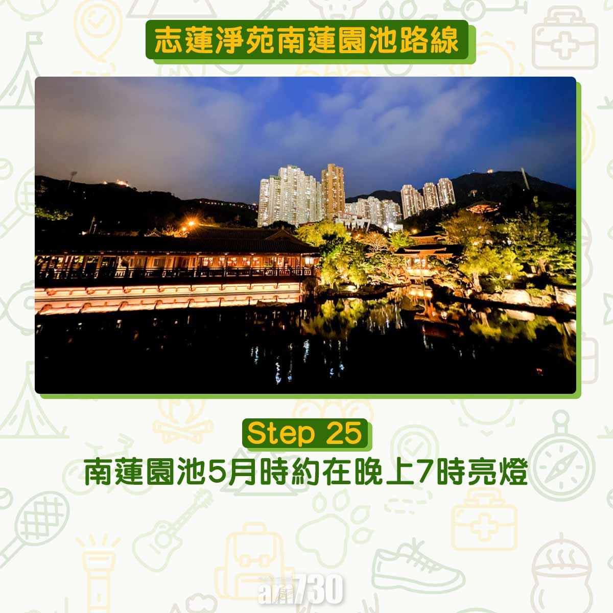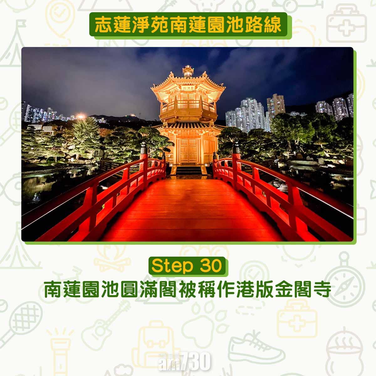 某天朋友問我有沒有去過南蓮園池,他晚上到訪驚為天人,開心分享靚相,只能用金碧輝煌形容。於是筆者決定黃昏前到訪南蓮園池。平日下午的南蓮園池遊人不多,水流聲不斷,把馬路的汽車聲消音,如同離開了城市。實測過5月到訪時,晚上約7時左右就會亮燈。亮燈後經水月臺回望亭橋,湖水把金光複製,絕不能錯過。經香海軒到午橋前,3層的圓滿閣確是金碧輝煌,被冠以「港版小京都」或「港版金閣寺」不算誇張。