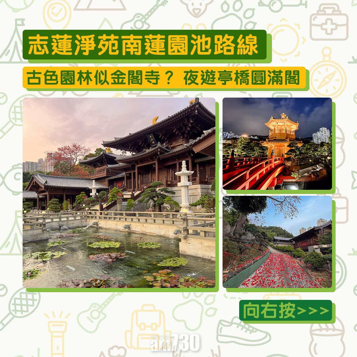 志蓮淨苑(Chi Lin Nunnery)及南蓮園池(Nan Lian Garden)由一條橋連接,距離鑽石山站僅5分鐘,是香港一日遊著名景點。作為世界最大手造木構建築群,其彷唐代及日本建築配合、盆景、羅漢松,像回到過去。蓮池倒影把「港版金閣寺」圓滿閣昇華,晚上夜遊格外迷人。