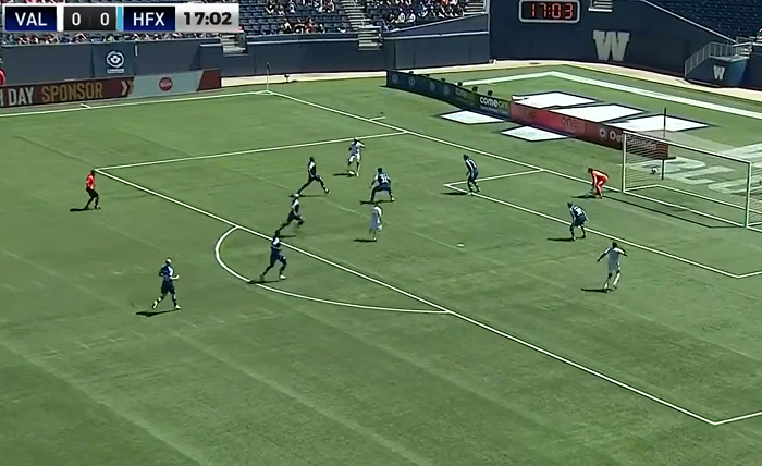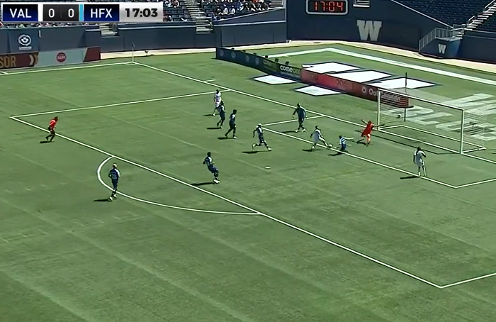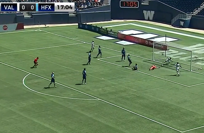正當隊友都在慶祝之時,球證卻判界外球。而溫尼伯榮軍球員雖然向球證指已經進入白界,不過球證之後解釋原因。最終阿基奧被隊友指責,並在下半場被換走。幸好的是,溫尼伯榮軍在下半場84分鐘取得入球,以1球擊敗HFX流浪,總算取得3分。