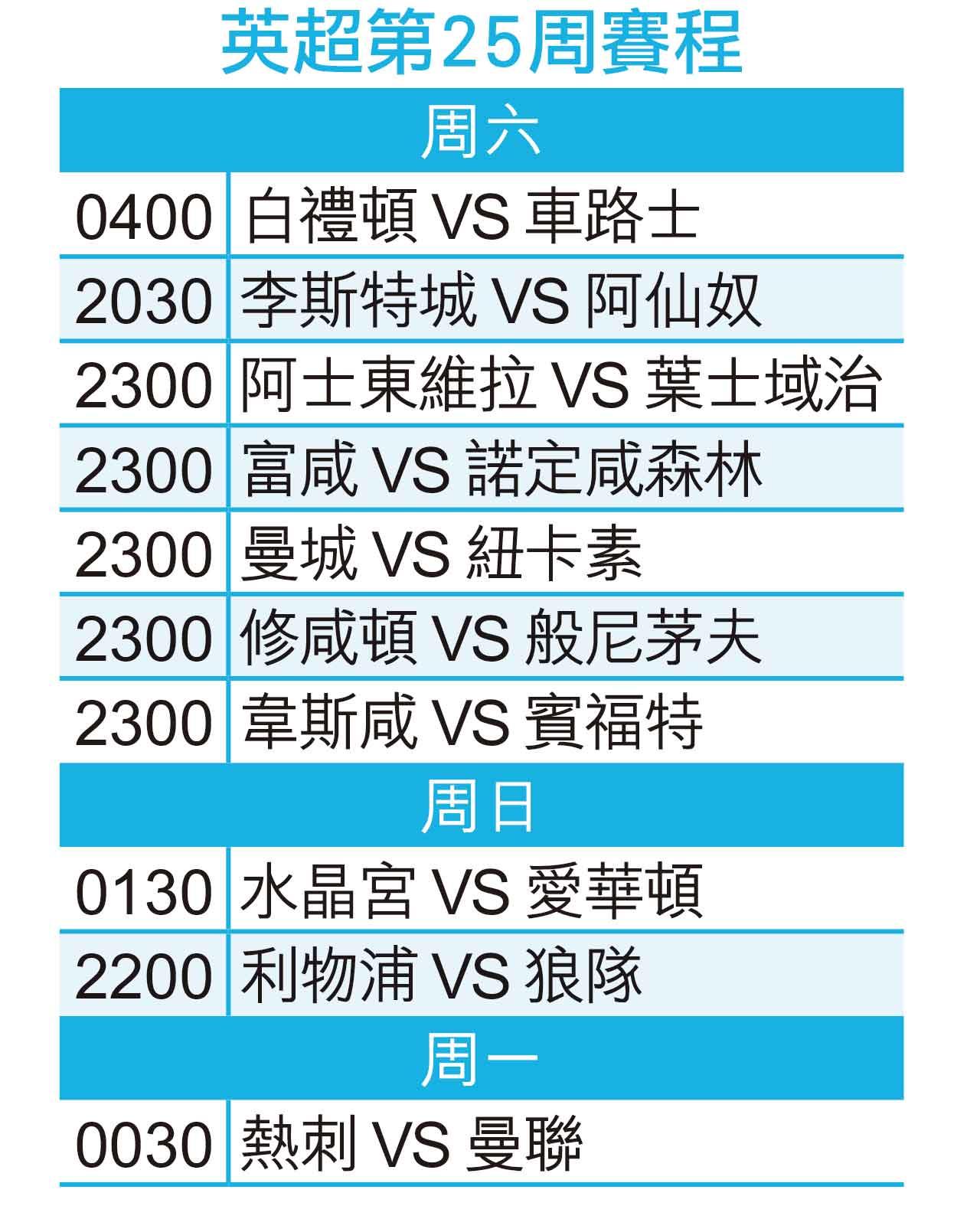 英超第25周賽程