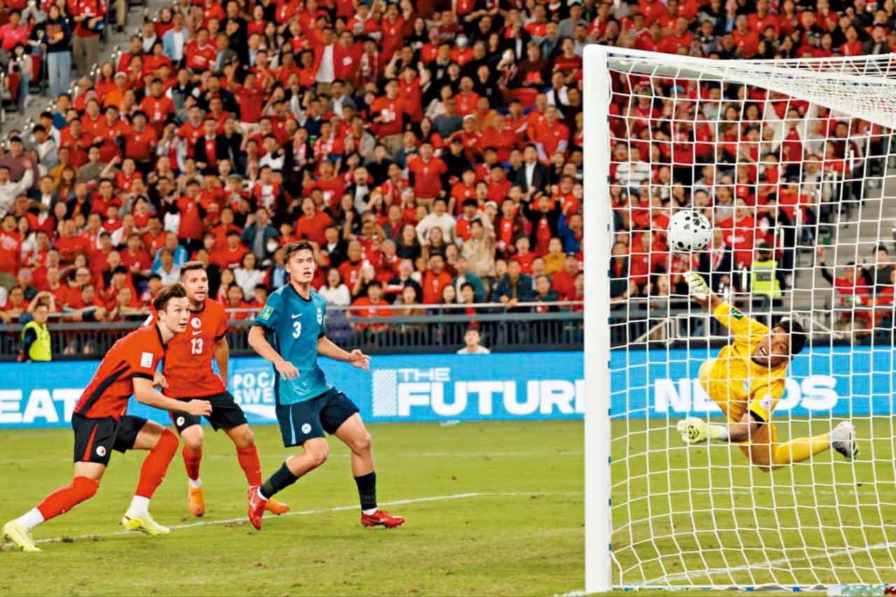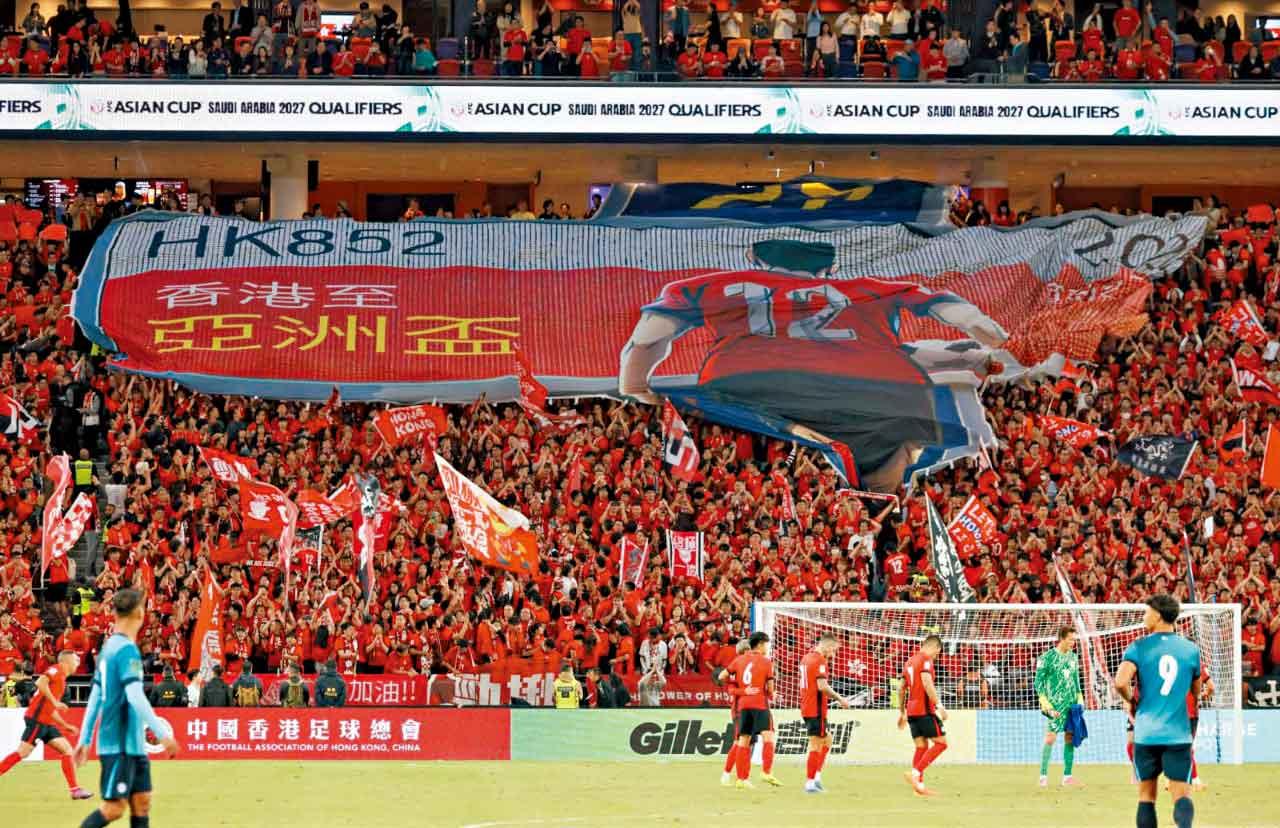 亞洲盃外圍賽分組賽,中國香港足球表隊在主場迎戰新加坡,港隊在領先半場下,終以1比2不敵新加坡。由於分組以對賽成績優先,賽前與港隊同分的新加坡於贏波後,以5戰11分提前一輪成為小組冠軍,取得2027亞洲盃決賽周入場劵,港隊則緣盡亞洲盃。攝影:蘇文傑攝