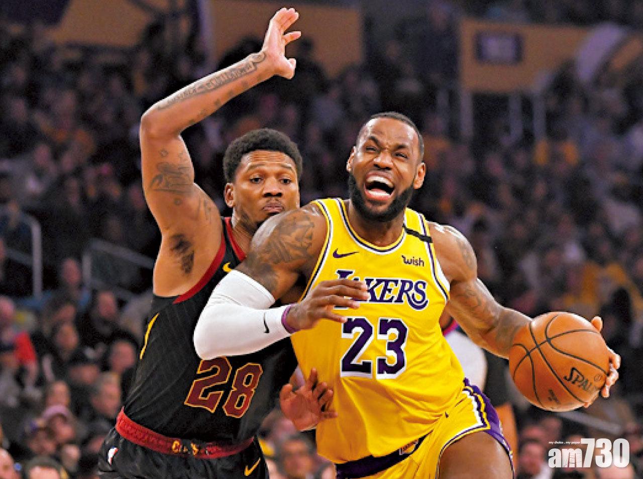 湖人主場迎戰騎士,藉著勒邦占士(圖右)攻入全場最高的31分,當中有23分於下半場取得,最終以128比99大炒對手,取得9連勝。湖人今仗半場落後1分,但在第三節愈戰戰勇,以一段13比0的攻勢拉開比數,最終取得29分大捷。