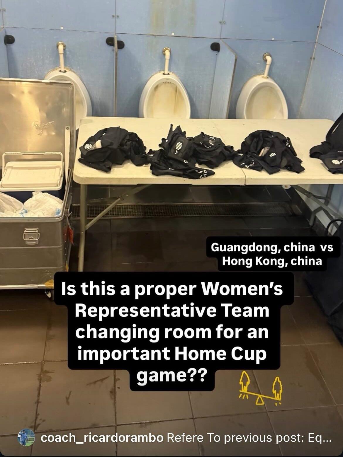 周日在香港分別進行了3場的省港盃比賽,包括是元老賽的首回合,女子組以及男子組首回合賽事。當中男子組在大球場與最後9人應戰的廣東隊踢平2:2。而下午在九龍灣公園的女子組比賽卻是引起更多網民爭議,源於女子隊主帥列卡度在社交平台上載限時動態,批評九龍灣公園的更衣室未有遮蓋男廁的尿兜,更是隨意就將裝備放在尿兜前的檯上。