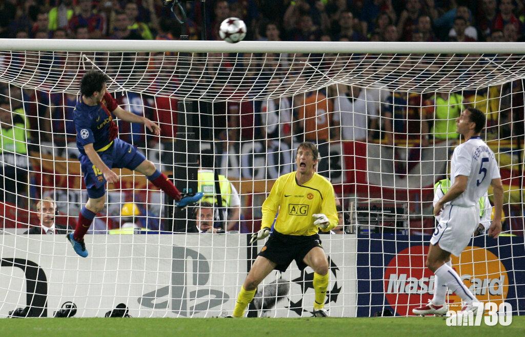 美斯於歐聯決賽對曼聯時頂入一球。(美聯社)