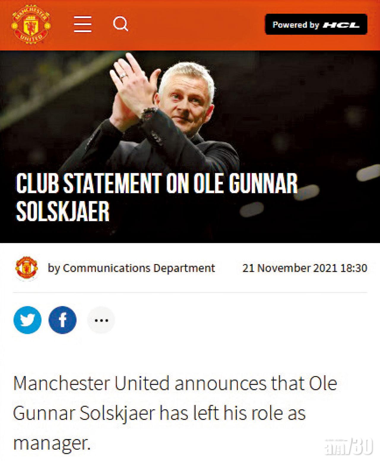 曼聯周日發表聲明:「曼聯正式宣布蘇斯克查已離任領隊職務,Ole(蘇帥名字)永遠也是曼聯的傳奇,但我們很遺憾要作這決定。雖然近期戰績令人失望,但這不能抹煞他過去3年,為我們爭取長遠成功而努力打好基礎的工作。我們再次感謝Ole的付出,並祝願他有美好將來。」