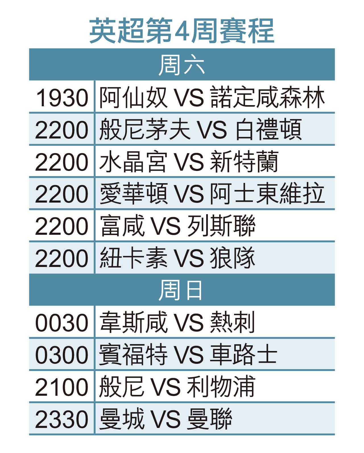 國際賽後,首場英超在明晚早場,由新敗的阿仙奴迎戰新帥的諾定咸森林。「兵工廠」一眾主力在國際賽期間表現搶鏡,今場在酋長球場鬥由前熱刺主帥領軍的森林,必多加兩錢肉緊,求將旺氣帶回倫敦。足智彩開出「讓球主客和」主隊[-1],可博主勝。(球賽編號FB5605,9月13日19:30開賽)
