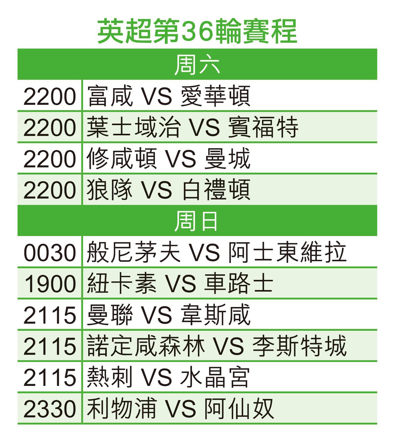 歐聯被「雙殺」出局後,「兵工廠」阿仙奴要收拾心情,匆匆在周日晚英超榜首大戰,作客鬥提早封王的利物浦;雖然兵工廠仍要「保次席、保歐聯」,但始終士氣大受打擊,據報今場賽前會列隊向新王者利物浦致敬,體力、氣勢大為輸蝕,今仗必博利物浦主勝。(球賽編號FB1546,5月11日23:30開賽)