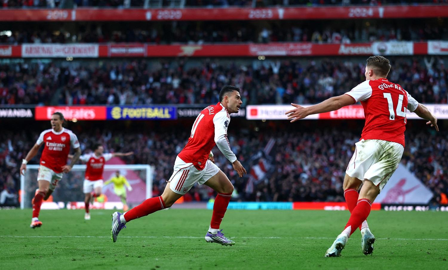 阿仙奴下半場換入傷癒的布卡約沙卡(Bukayo Saka)以及新兵的伊比爾治伊斯(Eberechi Eze)增強攻力,不過曼城有多次的機會,只是夏蘭特的攻門以及謝利美杜古(Jeremy Doku)都未能化為入球。直至補時的3分鐘,後備上陣的加比爾馬天尼利,巧妙笠過出迎的曼城門將基安盧基當拿隆馬(Gianluigi Donnarumma),最終令兵工廠主場迫和曼城1:1。阿仙奴失分後,聯賽5場得10分,落後全勝的利物浦5分排次席。