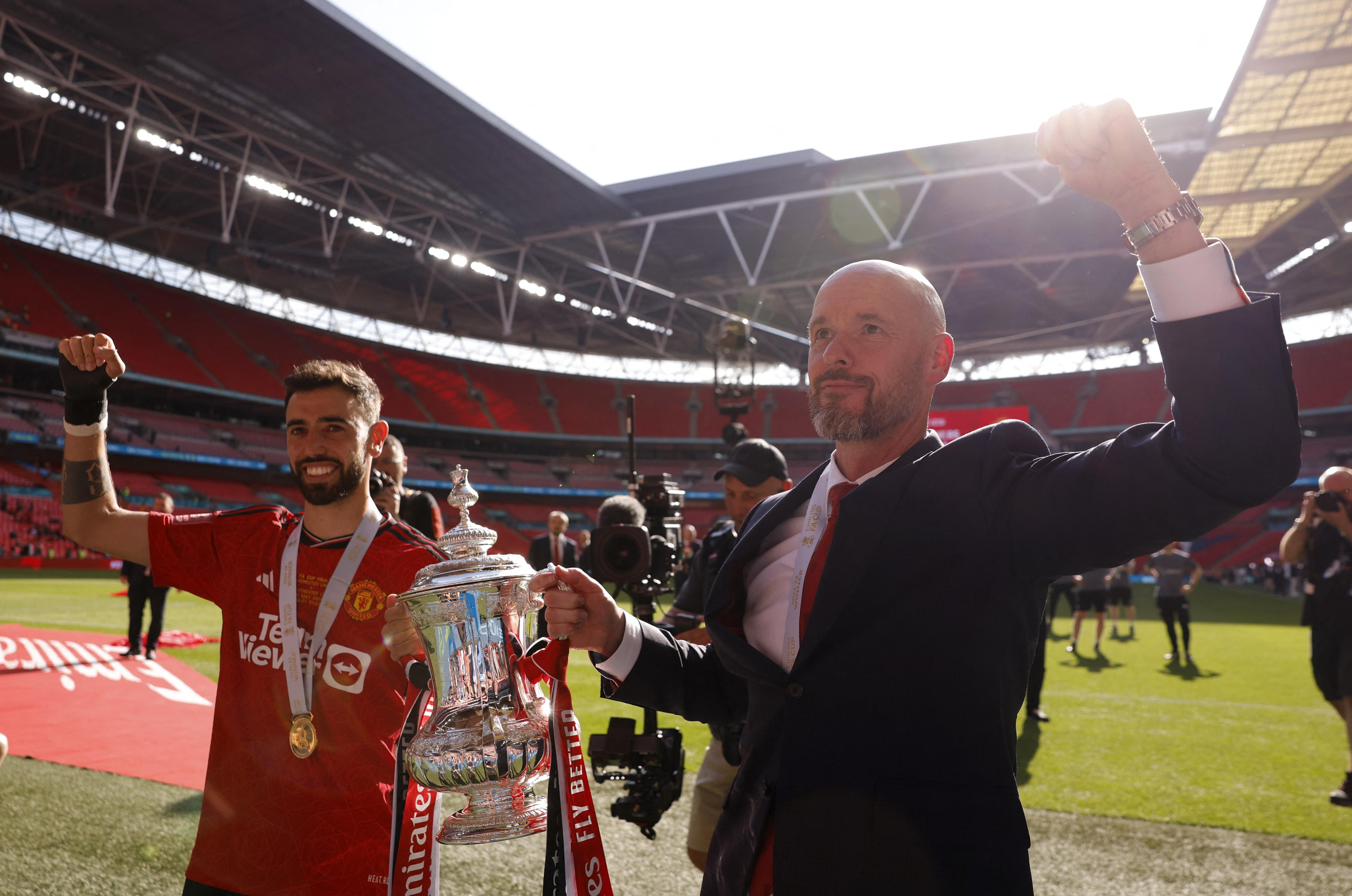 滕哈格意外地擊敗曼城捧足總盃,更獲得曼聯球員及球迷支持留任。(路透社資料圖片)