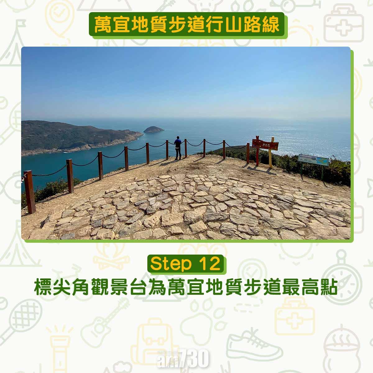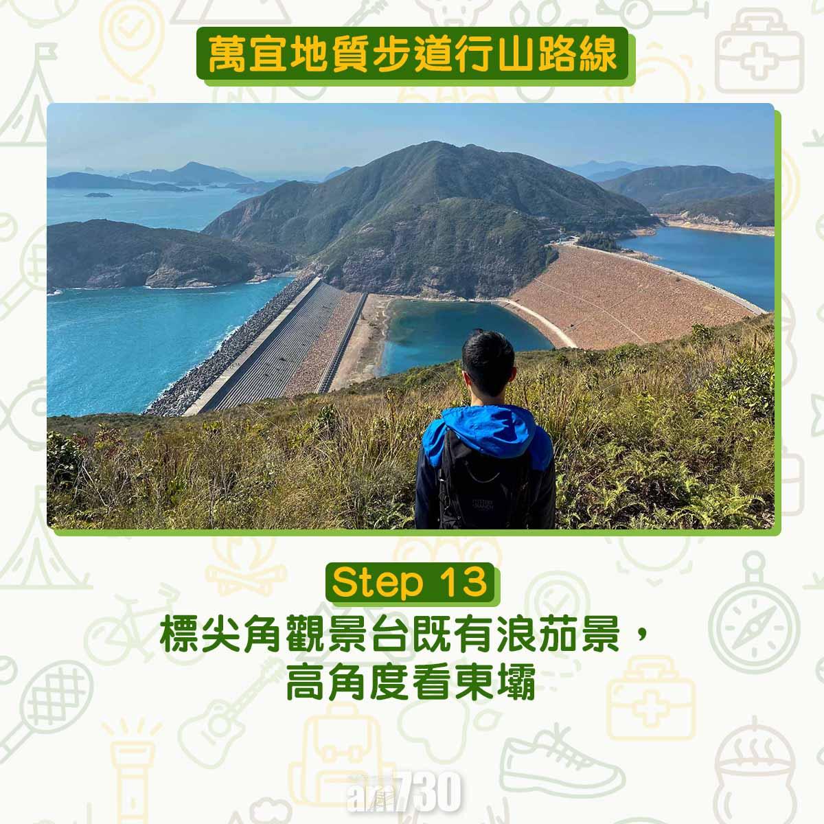 沿東壩涼亭和公廁後方的麥理浩徑(MacLehose Trail),路牌方向為浪茄和標尖角觀景台上斜。來回標尖角約1公里慢行連拍照約1小時,欠體力或時間可省略。上樓級約右轉沿不平整沙石路,抵設木製自拍台的標尖角觀景台。浪茄灣的玻璃水,以睇魚岩頂、罾棚角咀、破邊洲等都各有吸引力,270度西貢景怎會不美?