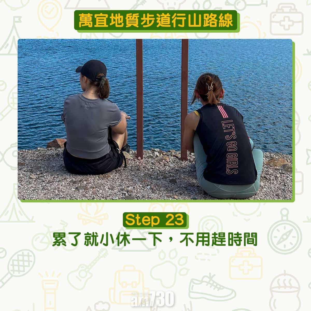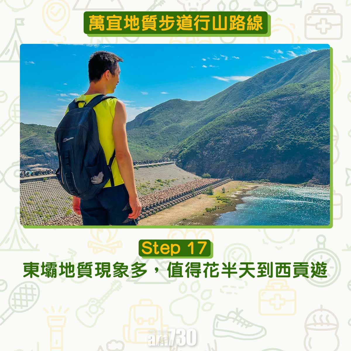 萬宜地質步道大部份為石屎路,有公廁、涼亭、資料介紹牌等,設施完整。然而西貢東壩沒有樹蔭,帶備足夠糧水及做好防曬準備才出發,出發前要考慮天氣,避開炎熱和天氣不穩日子。