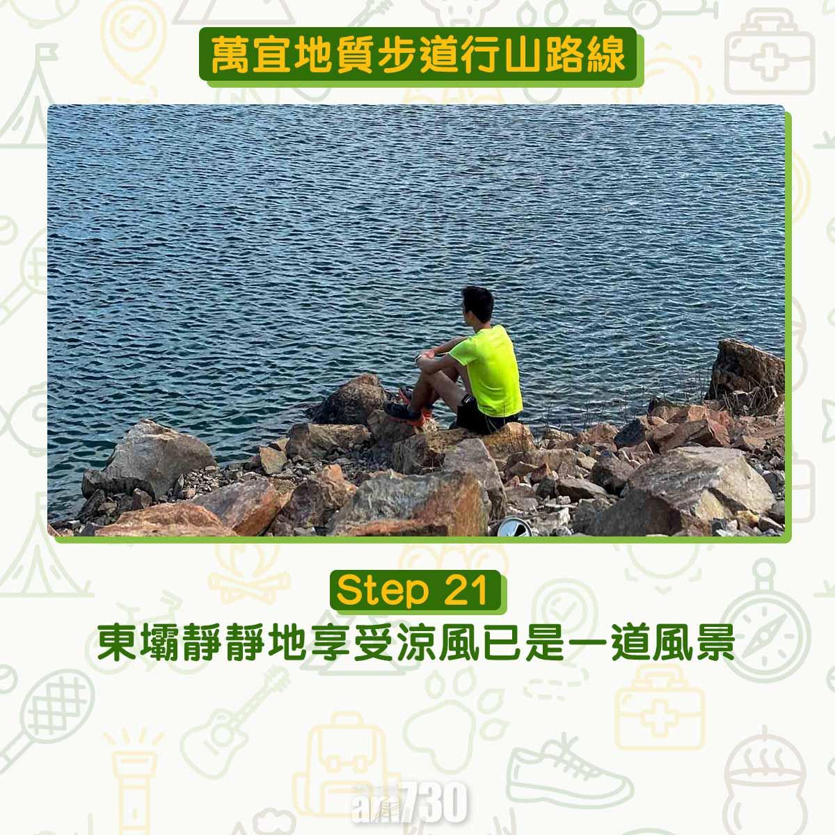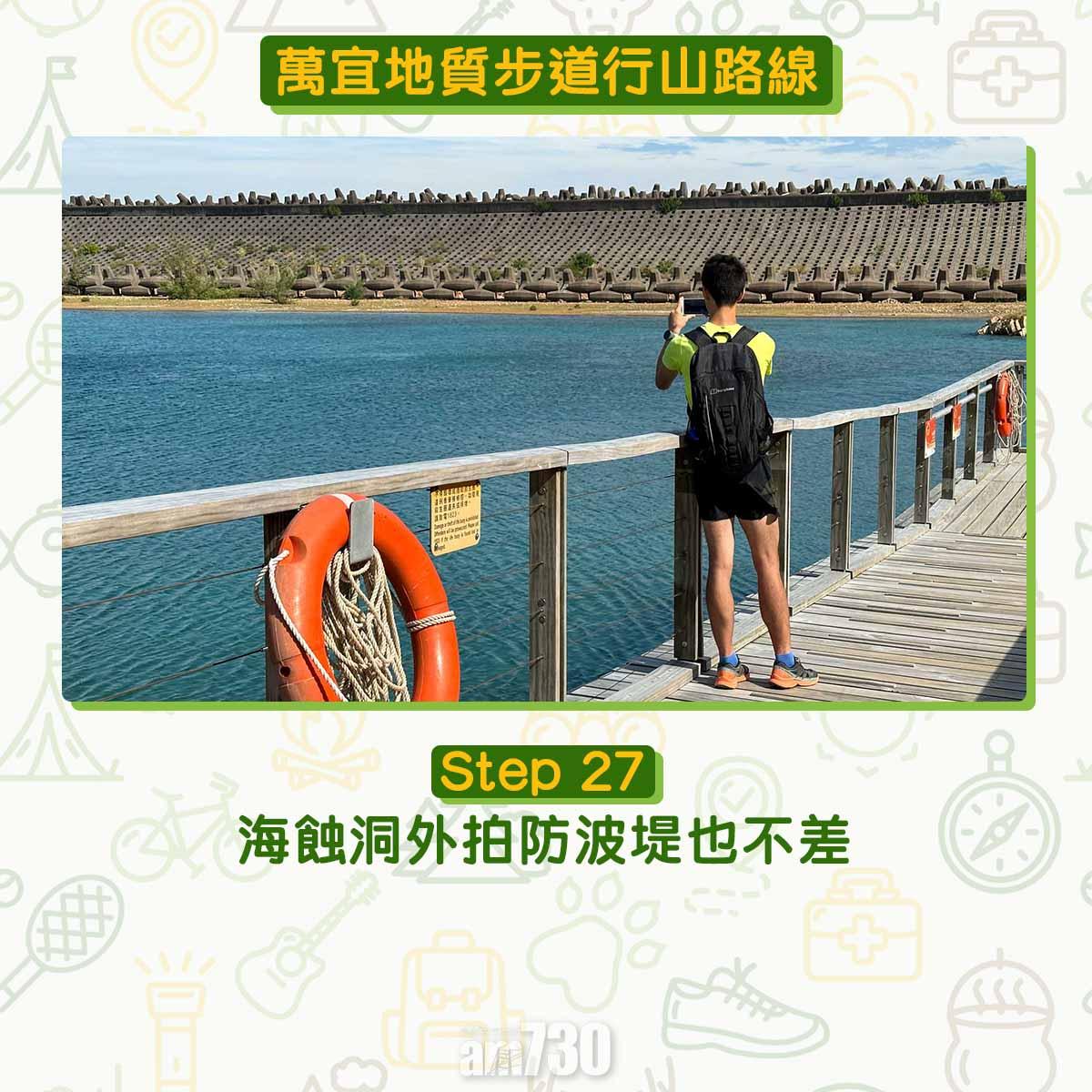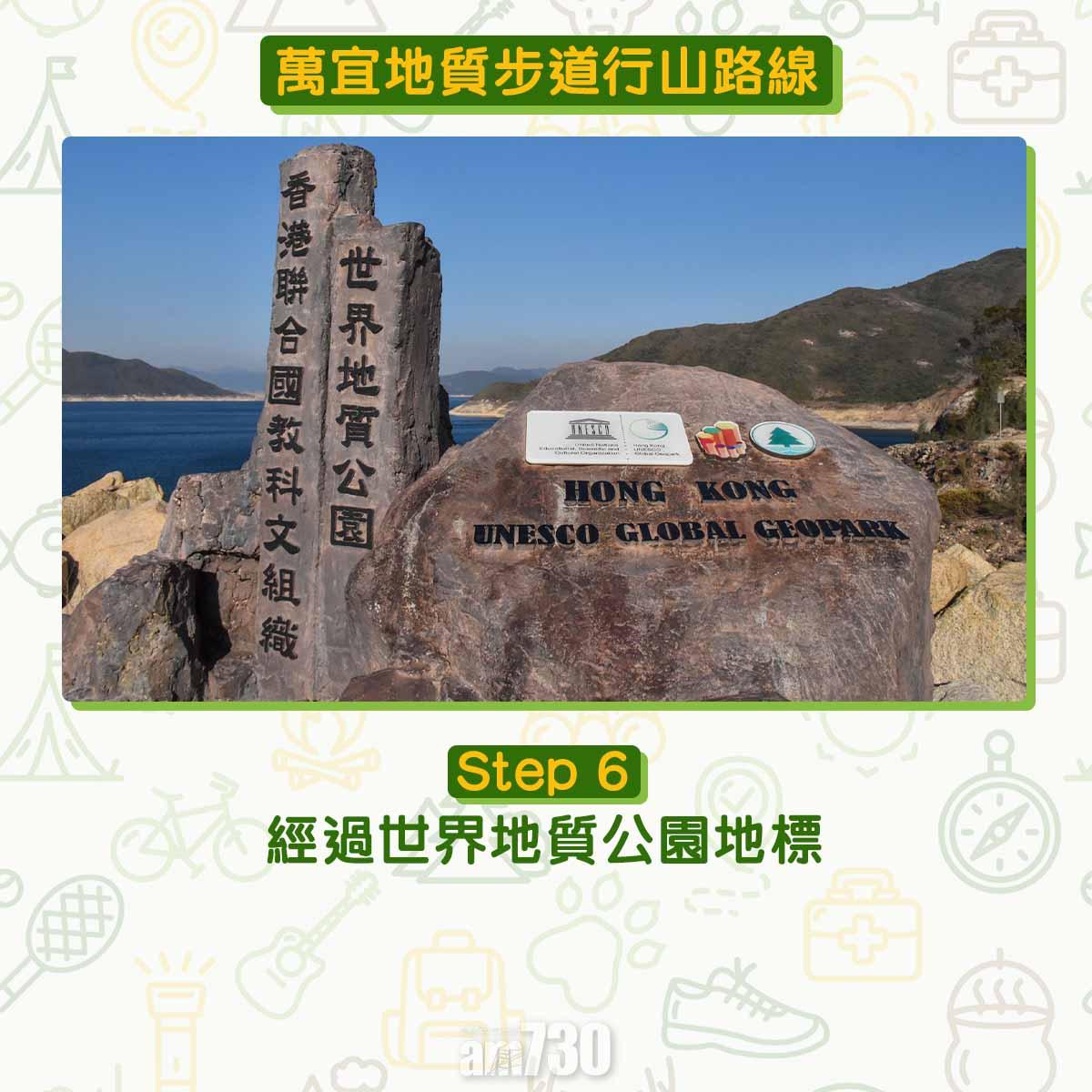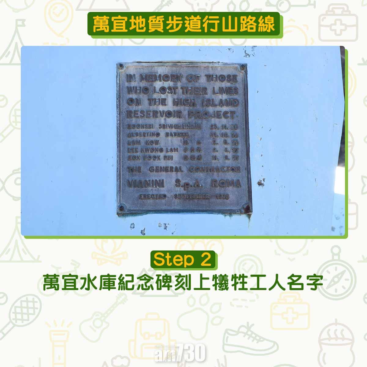 乘的士或小巴到萬宜水庫東壩,沿路風光已教人想盡快跳落車拍照。萬宜地質步道首個景點為小巴站旁的淺藍色紀念碑,紀載1979年供水的萬宜水庫建造時5名犧牲的工人。根據梁榮亨著《香港野外奇觀》,萬宜水庫東壩防波堤,由7千多塊防波石組成。數百米的防波堤連同右方的破邊洲及花山,拍照不停。破邊洲原是花山一部份,但海蝕作用而一分為二,呈現到被切開的氣勢。