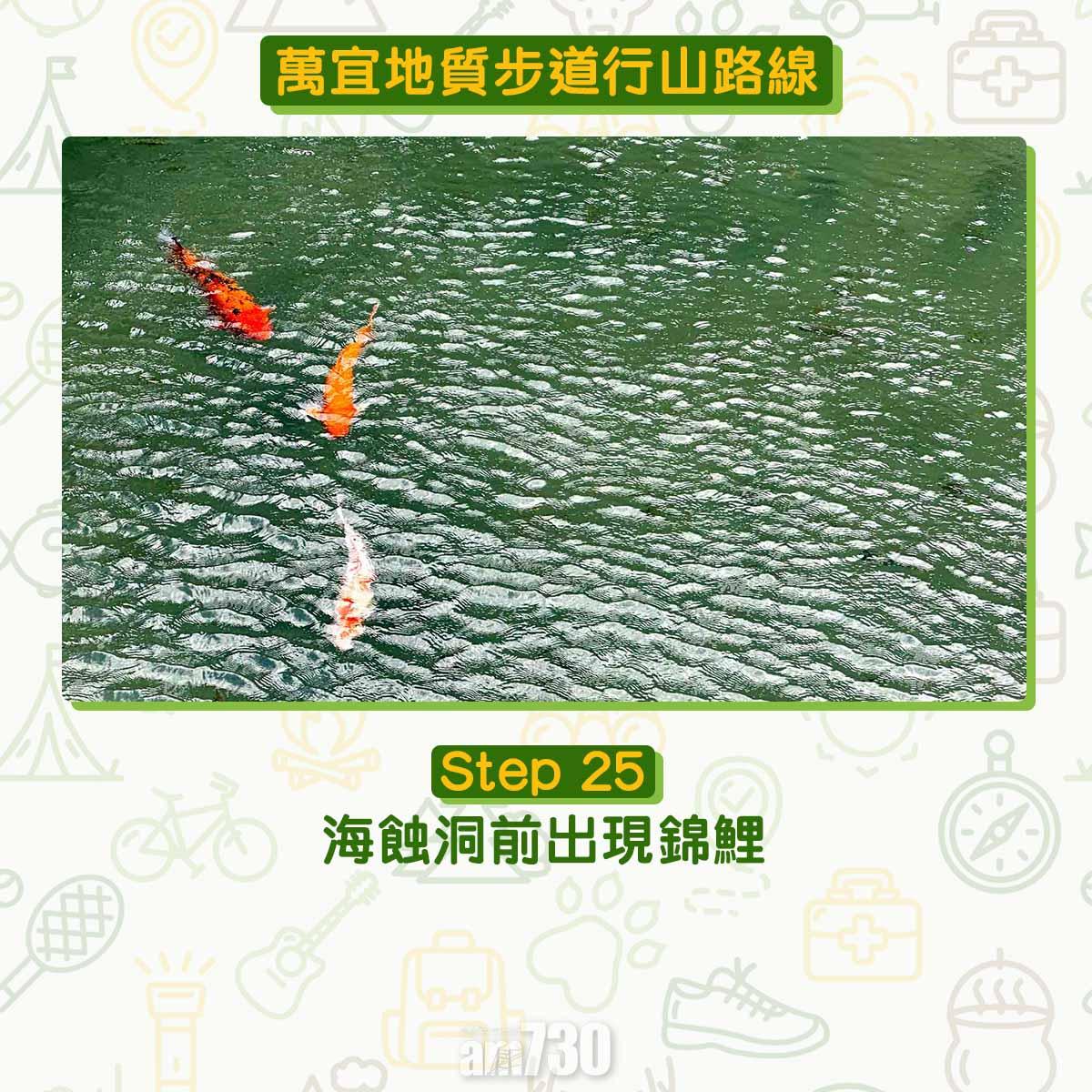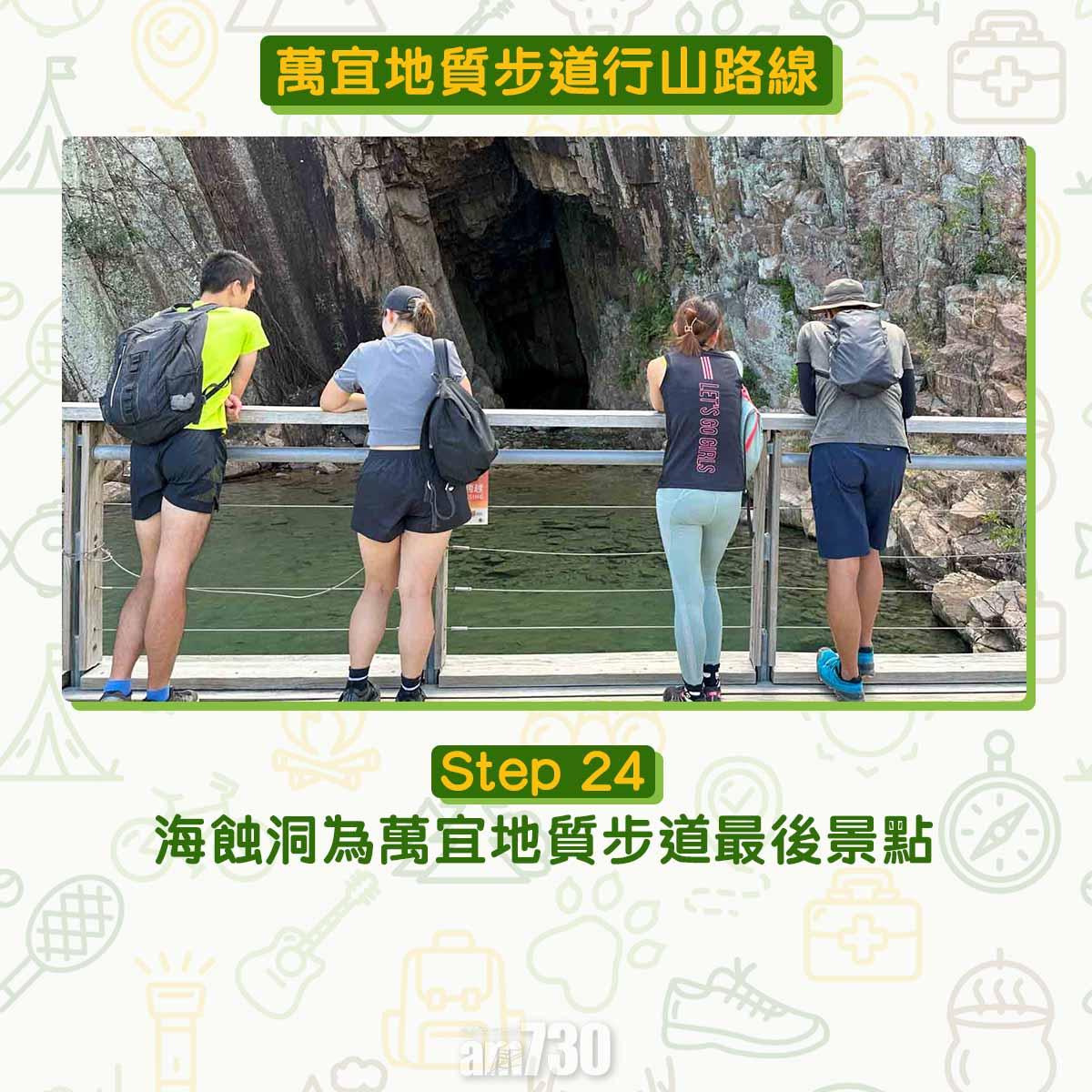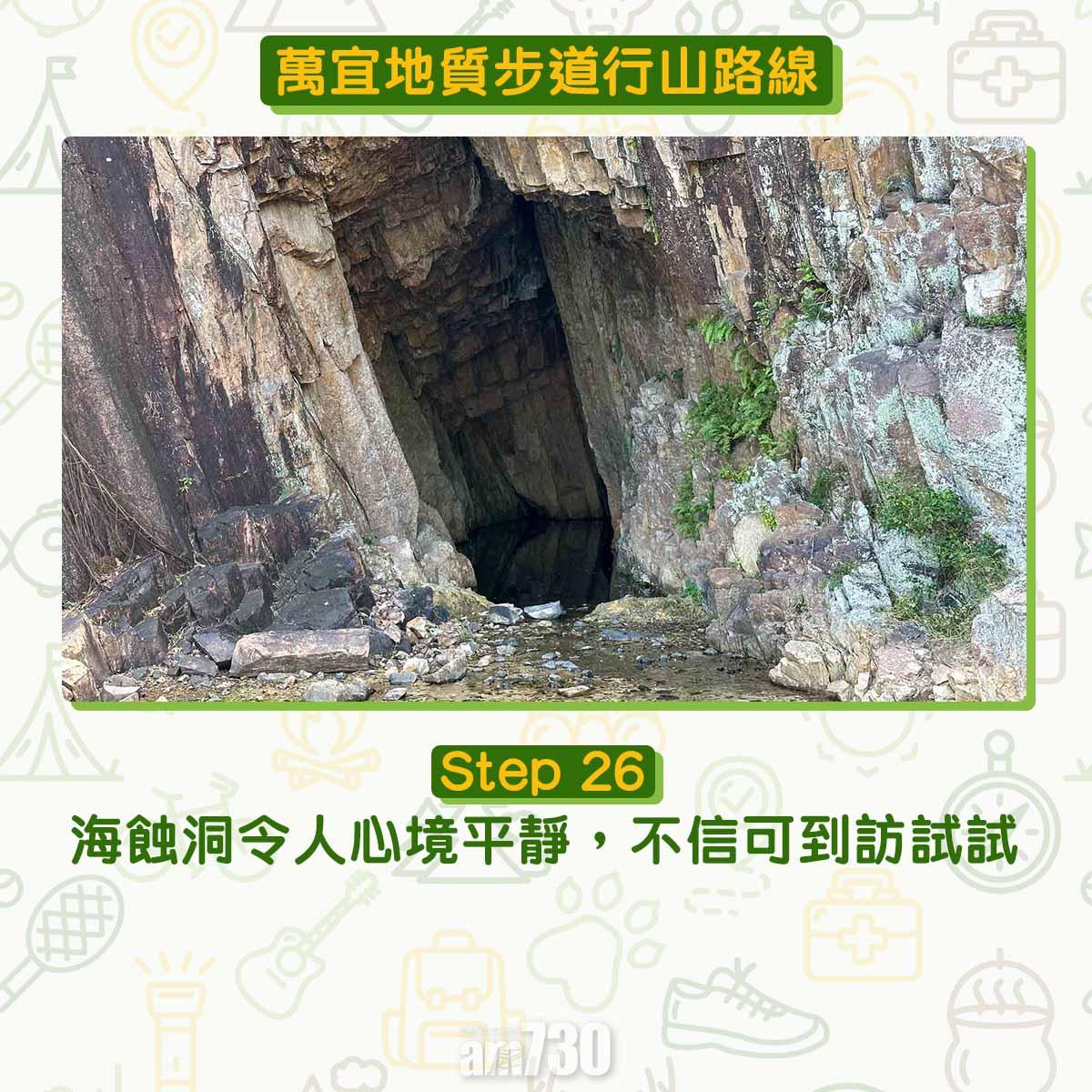 木橋步道盡頭近看海蝕洞,甚有驚喜。魚在水中慢游,輔以海蝕洞的回音,令人不知不覺放鬆下來,功效顯著。於此完結萬宜地質步道,意猶未盡的可經花山一看破邊洲全相,來回約1.5小時,又可前往浪茄、檢豬灣、等地方,否則便可乘的士回家。最緊要自己垃圾自己帶走,不要破壞環境及帶走岩石。