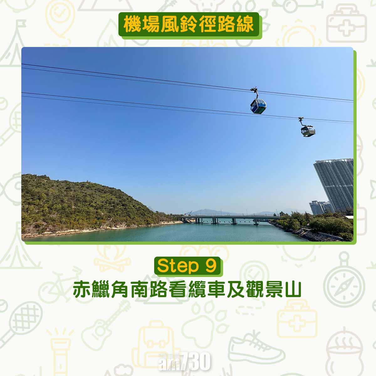 機場風鈴徑位於大嶼山東涌國泰城及古窯公園及機場古物園旁。赤鱲角東涌站B出口穿室內巴士站後,小心過馬路,於大嶼山巴士站旁右轉入達東路花園,近距離看到纜車來來回回。在加水站和公廁後方上行人天橋。落天橋時左轉往行人路兼離開單車徑,前往經赤臘角南路,頭頂纜車來去自如。前行數十米的櫻花大道及東涌櫻花園在2月上旬盛放 ,3月到訪時已不復再。路牌指示右方樓梯880級為東涌觀景山。