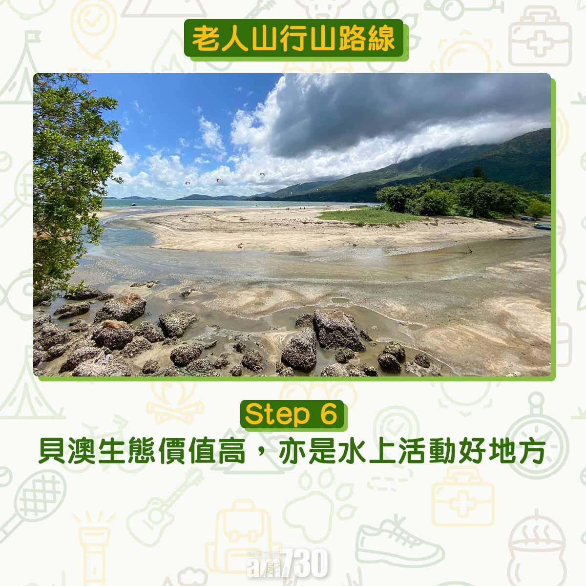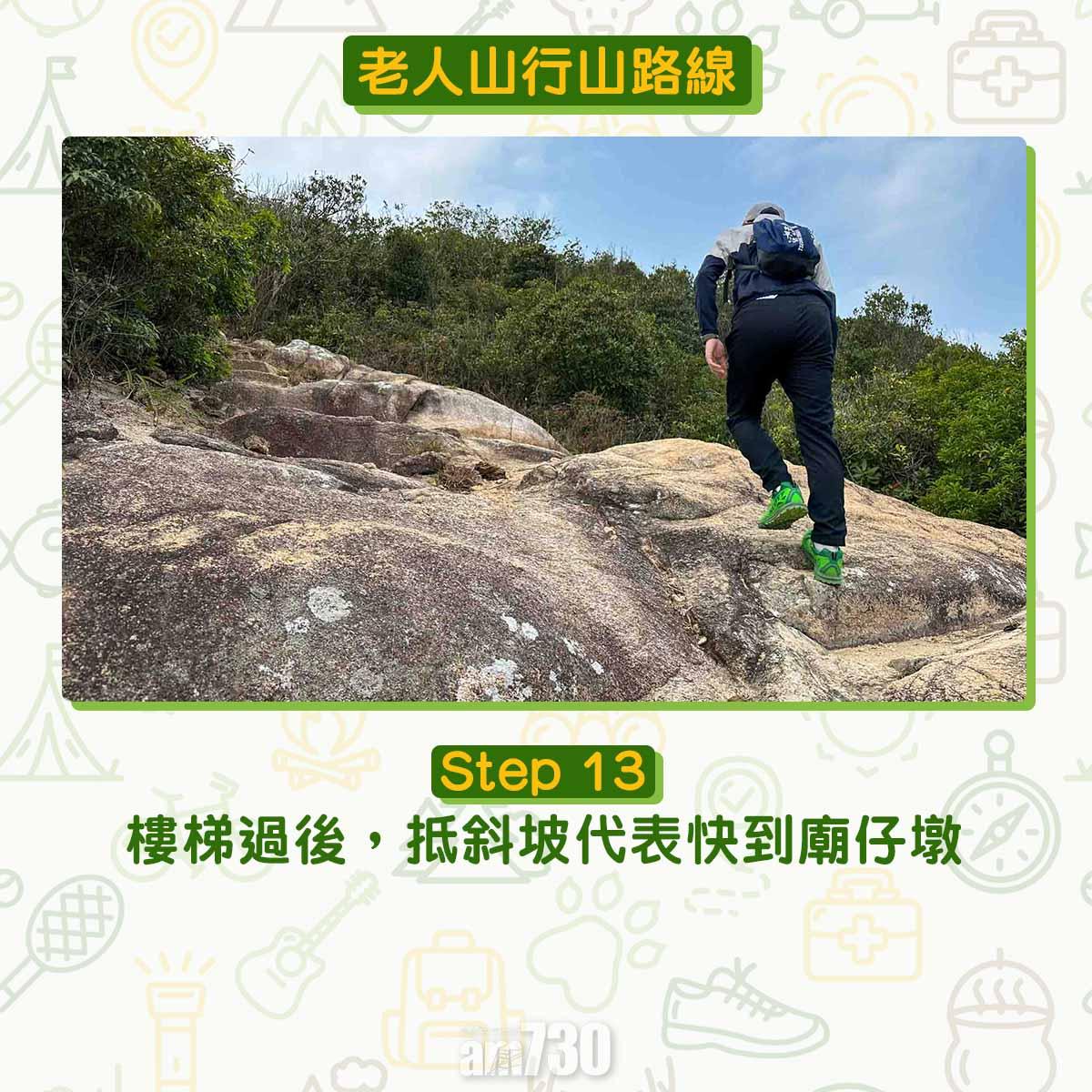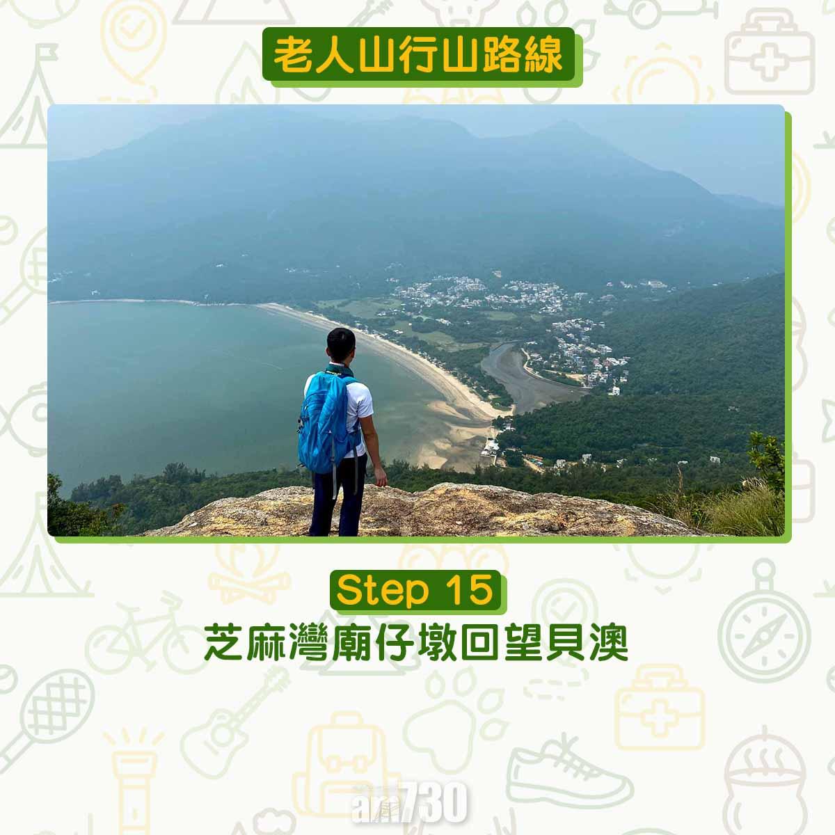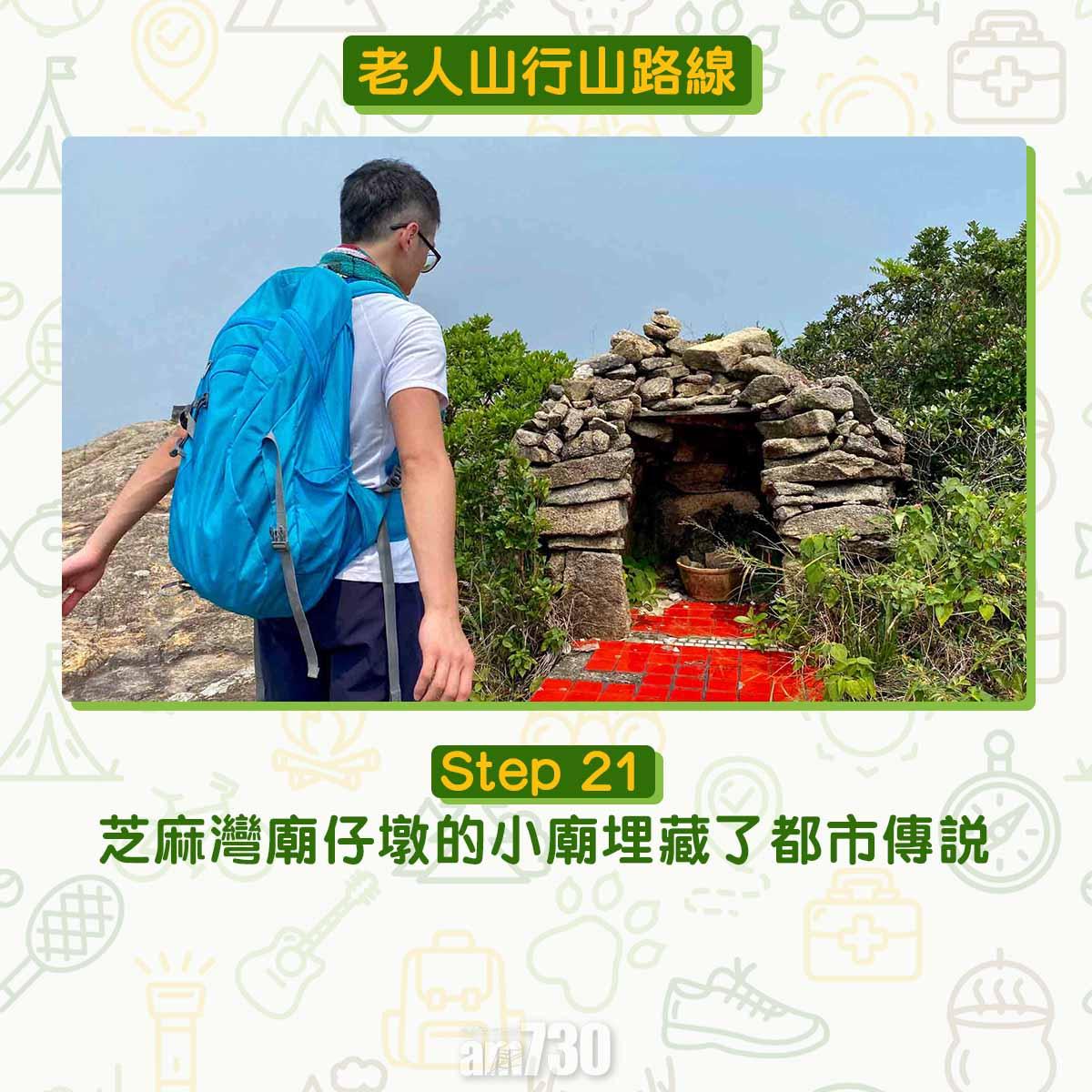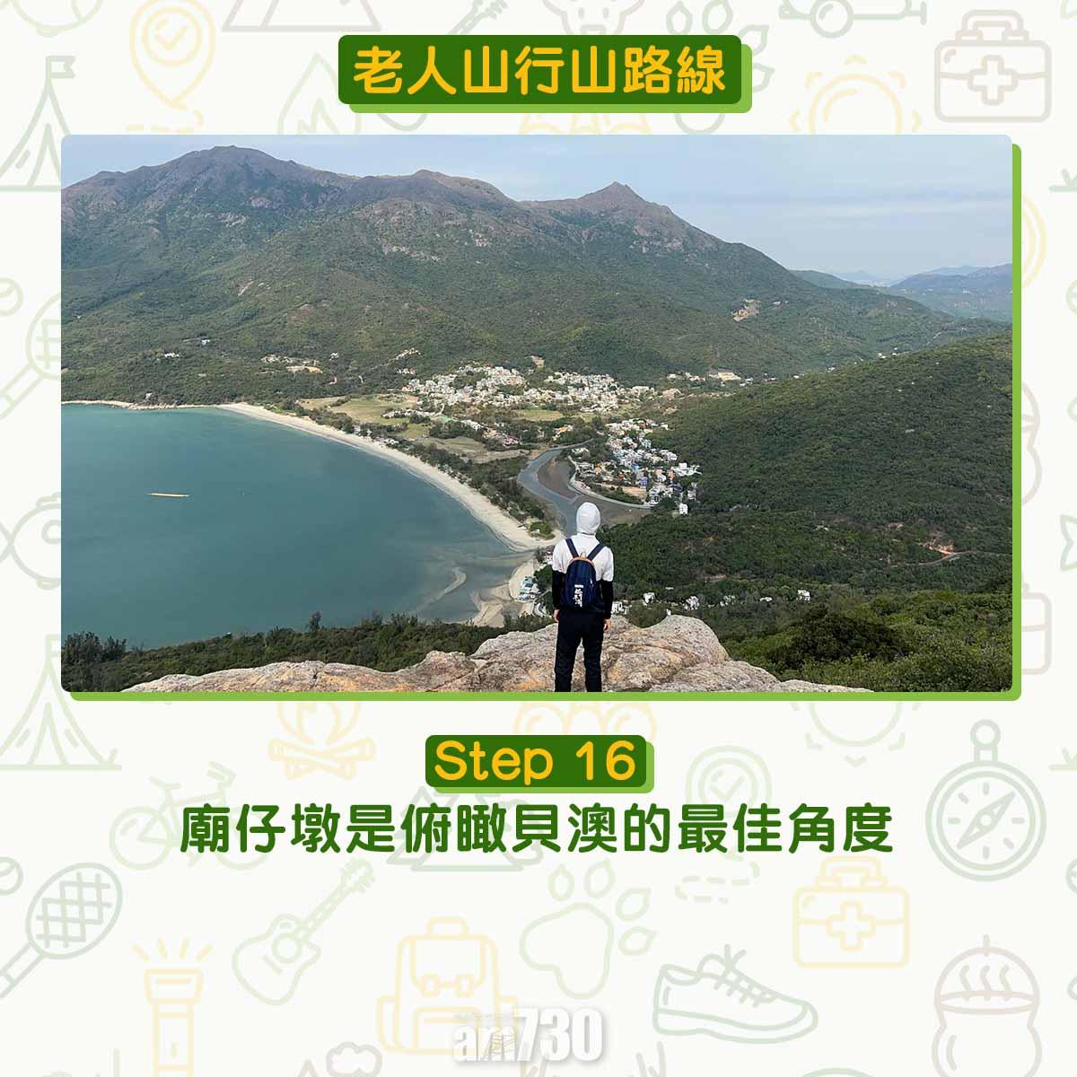 離開貝澳沙灘沿芝麻灣道上斜,見鳳凰徑12段路牌不要跟隨,右轉經芝麻灣郊遊徑牌坊登樓梯,路口標示「龍尾經老人山」才可登廟仔墩及老人山。登廟仔墩約在1公里距離上升海拔250米,除了樓梯還是樓梯。木級比踏腳位更高,需要比平常用更多力抬腿。過木級後難度增加,夾雜碎石的斜坡加上強風,約20-40分鐘登頂比想像中耐。廟仔墩是完美俯瞰貝澳的高點,邊看邊反思天然沙咀、淡水濕地、沼澤、河溪等會否永續?傳說多年前有人經過廟仔墩上的小廟,擺低香油錢誠心參拜。他後來用找續的錢買馬票中三獎,後來回到廟仔墩還神。