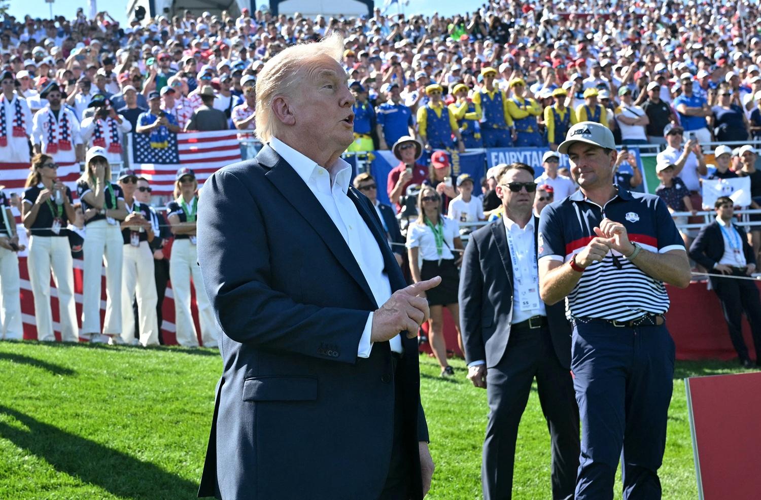 美國總統特朗普出席萊德盃的首日比賽。(路透社)