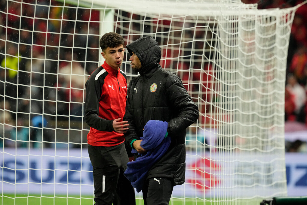 塞內加爾後備門將迪奧夫被摩洛哥球僮搶毛巾。(美聯社)
