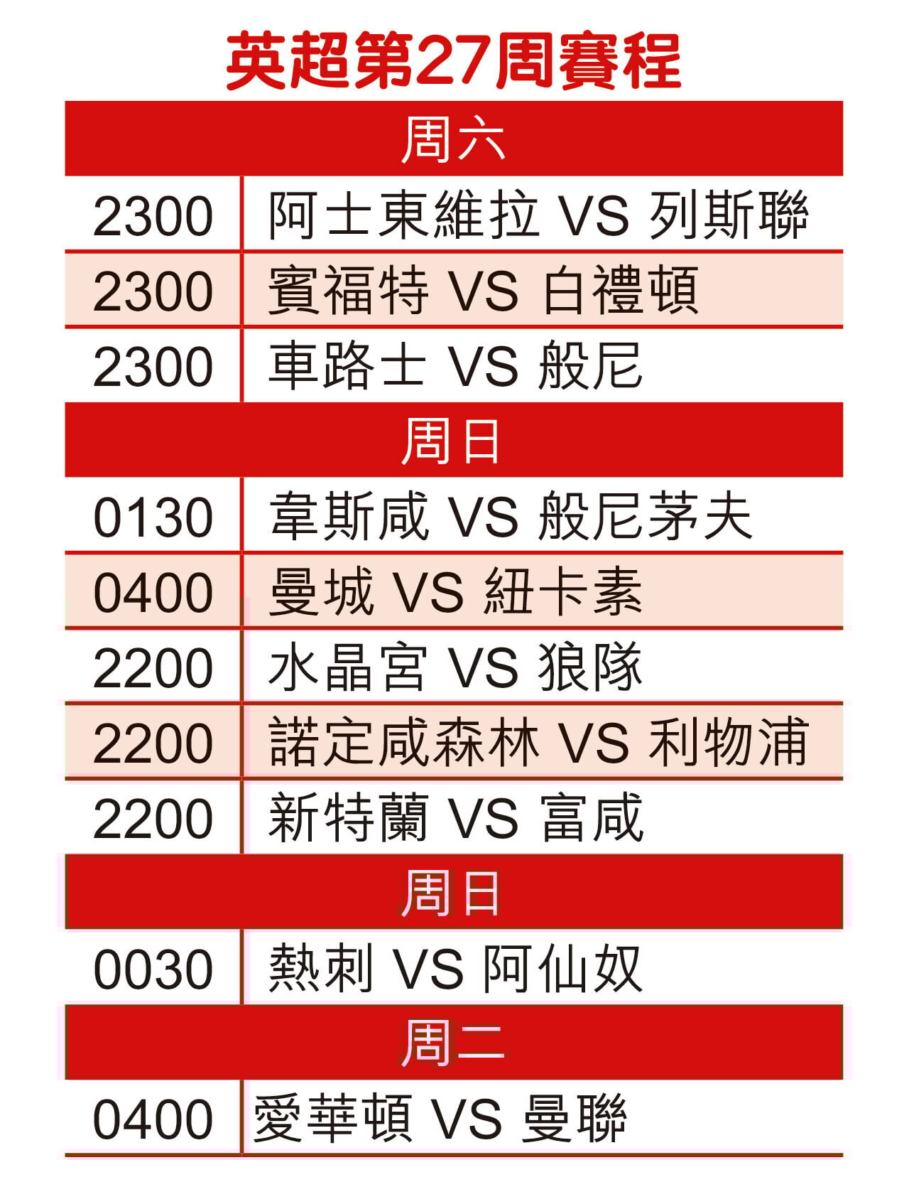 英超第27周賽程