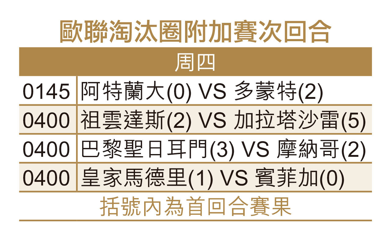 「班馬兵團」祖雲達斯上周歐聯淘汰圈附加賽首回合,作客竟大敗予土超班霸加拉塔沙雷,陷入出局邊緣;周三晚次回合回師主場,焗攻卻受主力球員傷停影響,今場寧捧受讓的土軍。(球賽編號:FB4407;2月26日04:00開賽)