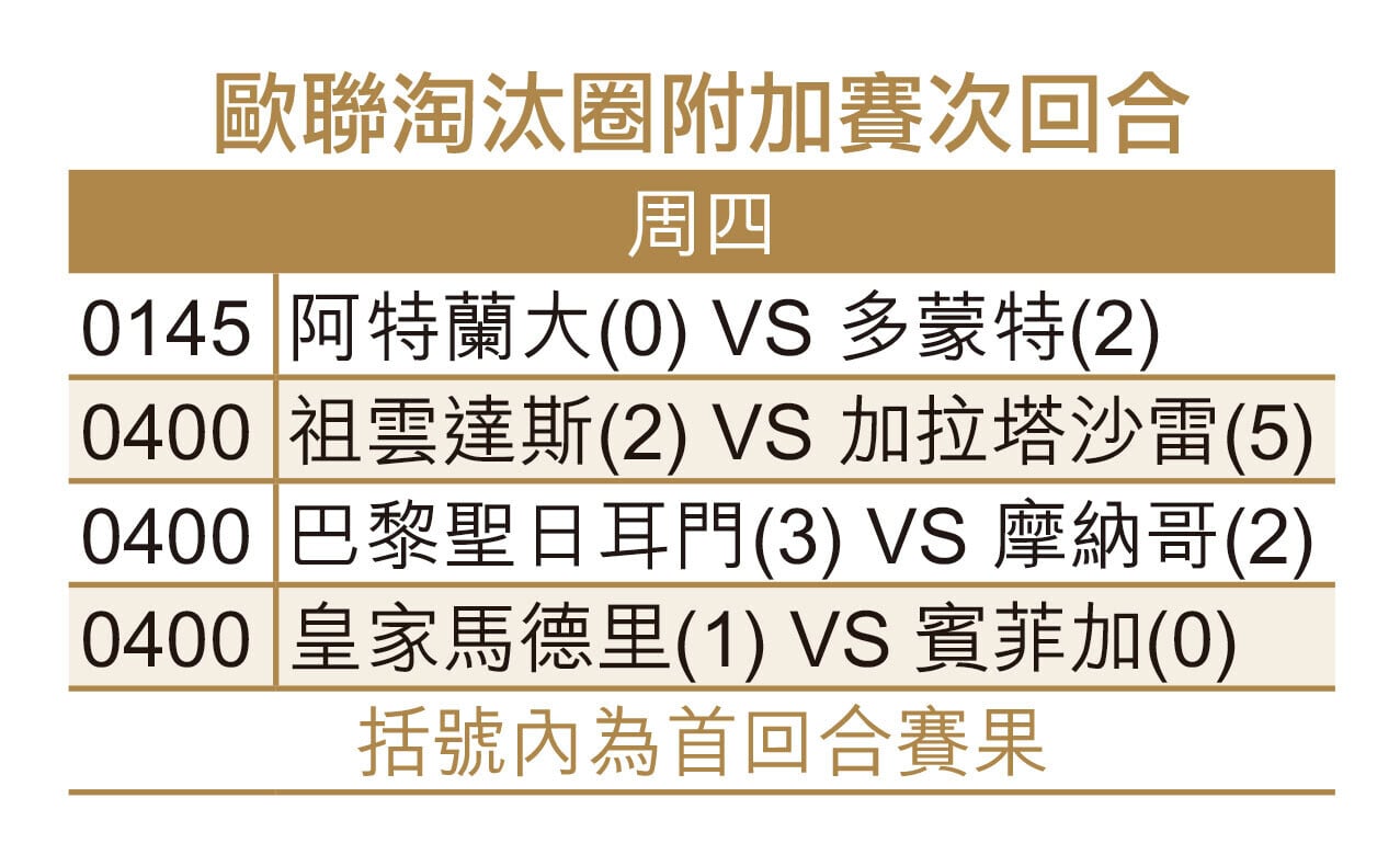 歐聯附加賽次回合,周三晚焦點必落在皇家馬德里主場對賓菲加。首回合「銀河艦隊」贏1比0,但比賽期間爆出種族歧視風波,將各界注意力分散。不過,這對於經驗老到的「寸王」賓菲加主帥摩連奴(Mourinho)而言,就算今場停賽無緣在場邊督師,但肯定無阻其一貫「泊大巴」打防反爭勝的「摩」法,可先捧中位數[3.5]球「細」盤。(球賽編號FB4408,2月26日04:00開賽)