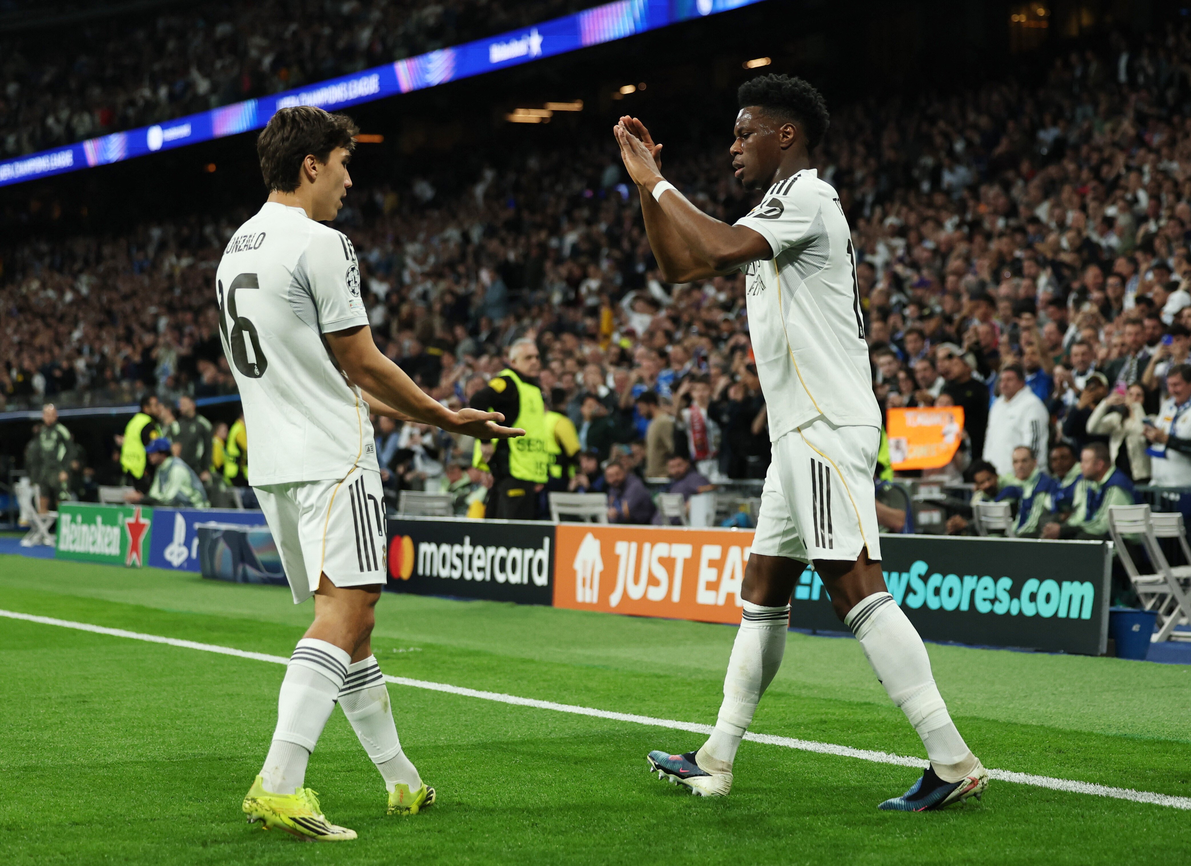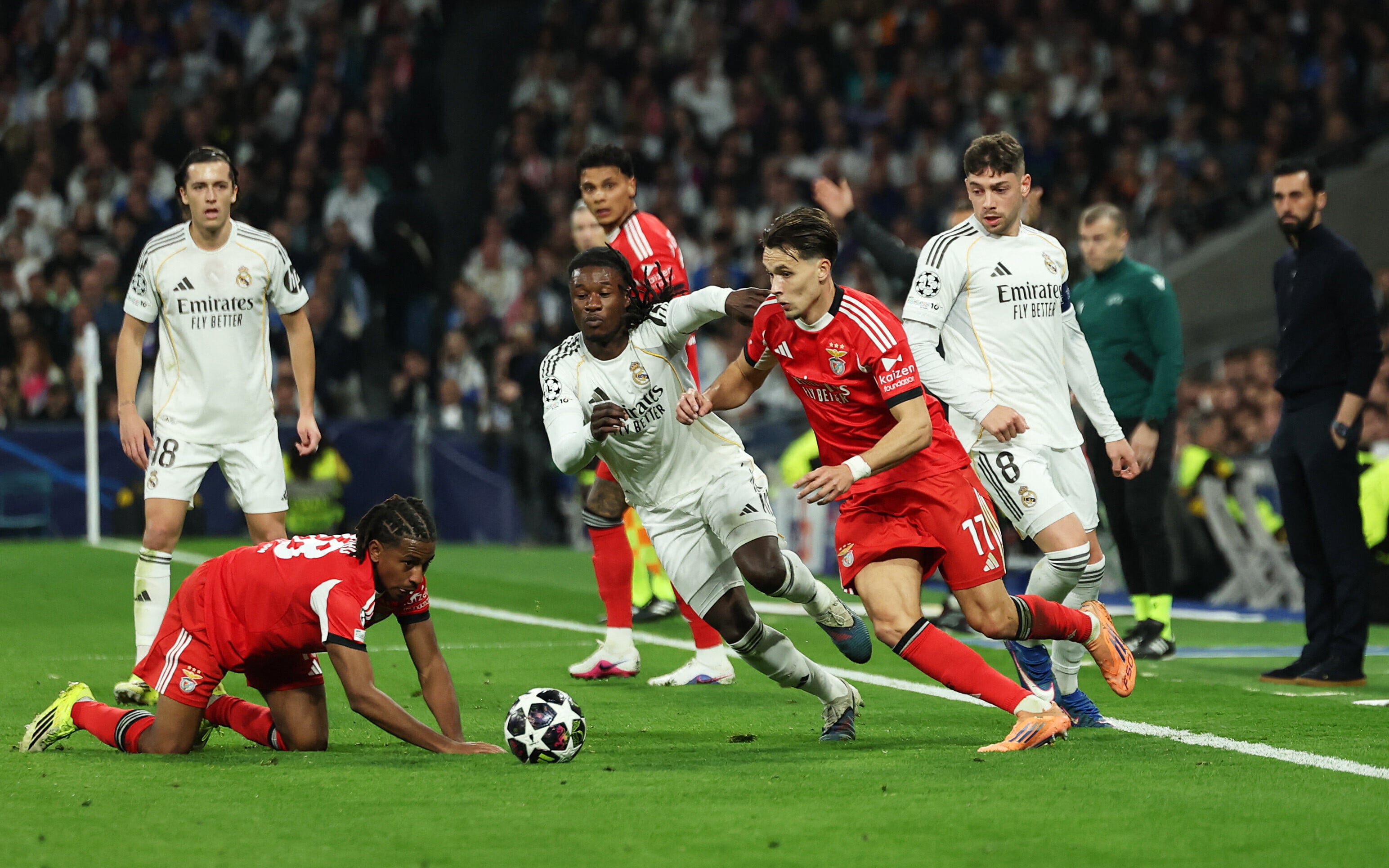 首回合憑雲尼斯奧斯祖利亞(Vinicius Junior)的入球領先的皇馬,而也因為這位前鋒的入球慶祝引發種族歧視爭議。在賓菲加的比列斯安甸尼(Gianluca Prestianni)被罰停賽下,客隊還是在14分鐘由拉法施華(Rafa Silva)打開紀錄。但是皇馬僅2分鐘後就由曹亞文尼(Aurelien Tchouameni)追平。之後皇馬有艾達古拿(Arda Guler)的入球被判「詐糊」,半場雙方各一言和。只需要1球追平的賓菲加,下半場無法再添比數,反而在80分鐘,備受爭議的雲尼斯奧斯為皇馬再入一球,令皇家馬德里以2:1擊敗賓菲加,兩回合以3:1比數晉級。皇馬16強對手會是曼城或是另一支葡萄牙球隊士砵亭。