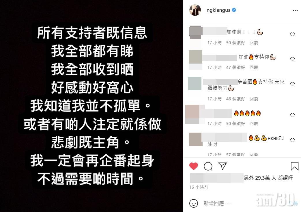 港羽「一哥」伍家朗IG感謝文吸逾29萬Like,當中不乏女藝人點讚。(伍家朗IG截圖)