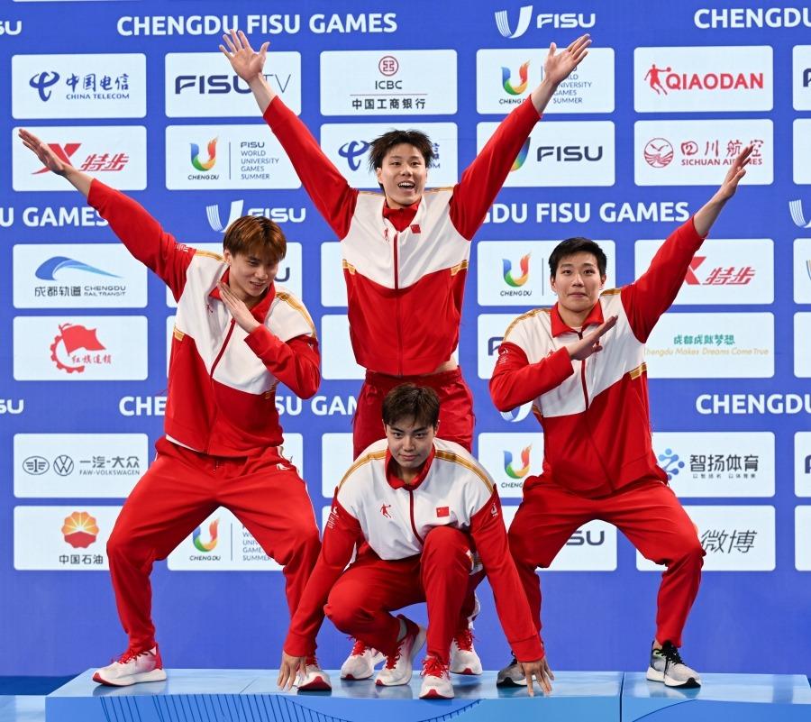 覃海洋(中上)2023年8月出戰成都大運會,他與陳俊兒(左二)、王谷開來(中下)、林濤(右二)摘得男子4×100米混合泳接力金牌。(圖片來源:視覺中國)