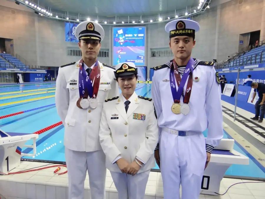 覃海洋(左)自小加入海軍游泳隊,現在是現役軍。圖為他與八一游泳隊功勳教練葉瑾(中)及隊友合照。(網上圖片)
