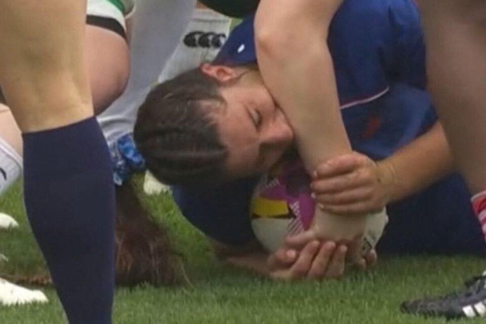 法國女子欖球代表在比賽中咬對手手臂。(影片截圖)